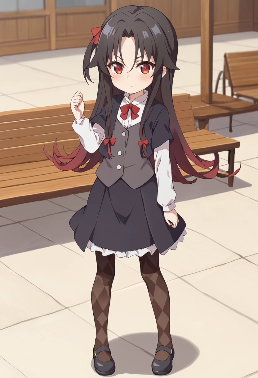 yashajin ai,red eyes,black hair, long hair,sidelocks, one side up,black jacket,white collared shirt,short over long sleeves,grey vest,black skirt, frilled skirt, argyle pantyhose, mary janes