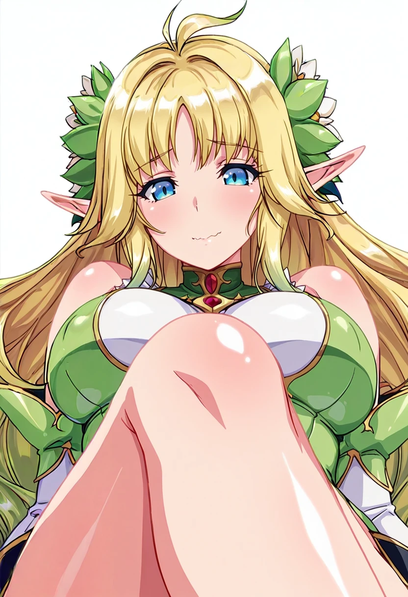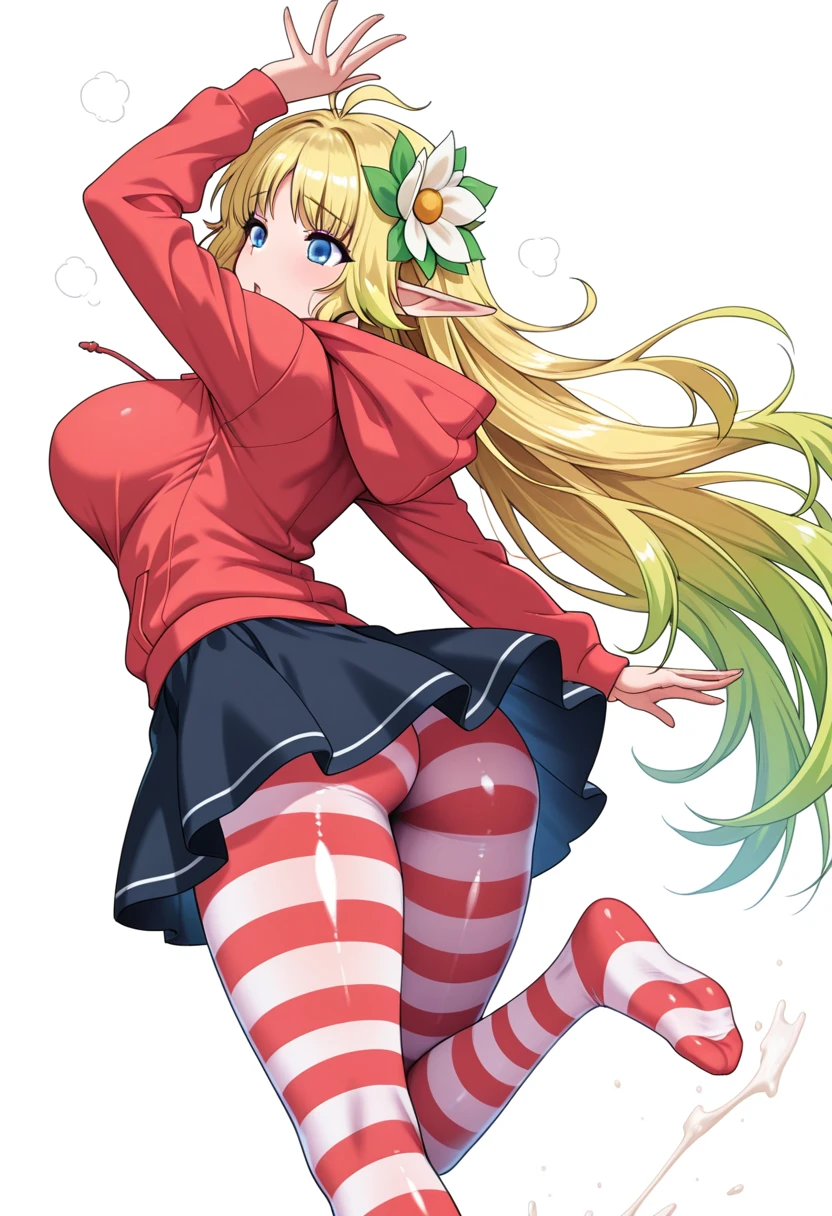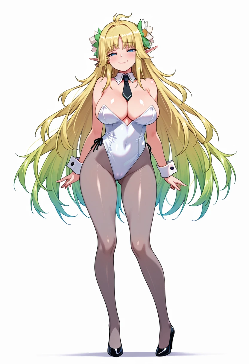 stentreim_cnr, 1girl,blonde hair, hair over one eye, elf, purple eyes, large breasts, very long hair, gradient hair, shiny skin,
