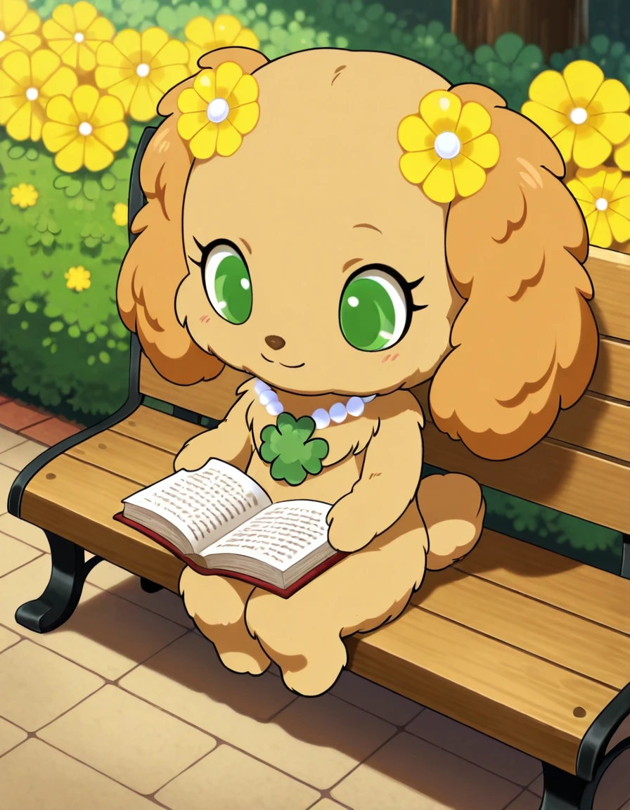 chibi, digitigrade, orange fluffy ears, light brown fur, light brown tail, light brown body, yellow flower on head, pearl necklace, clover brooch, chest fur, green eyes