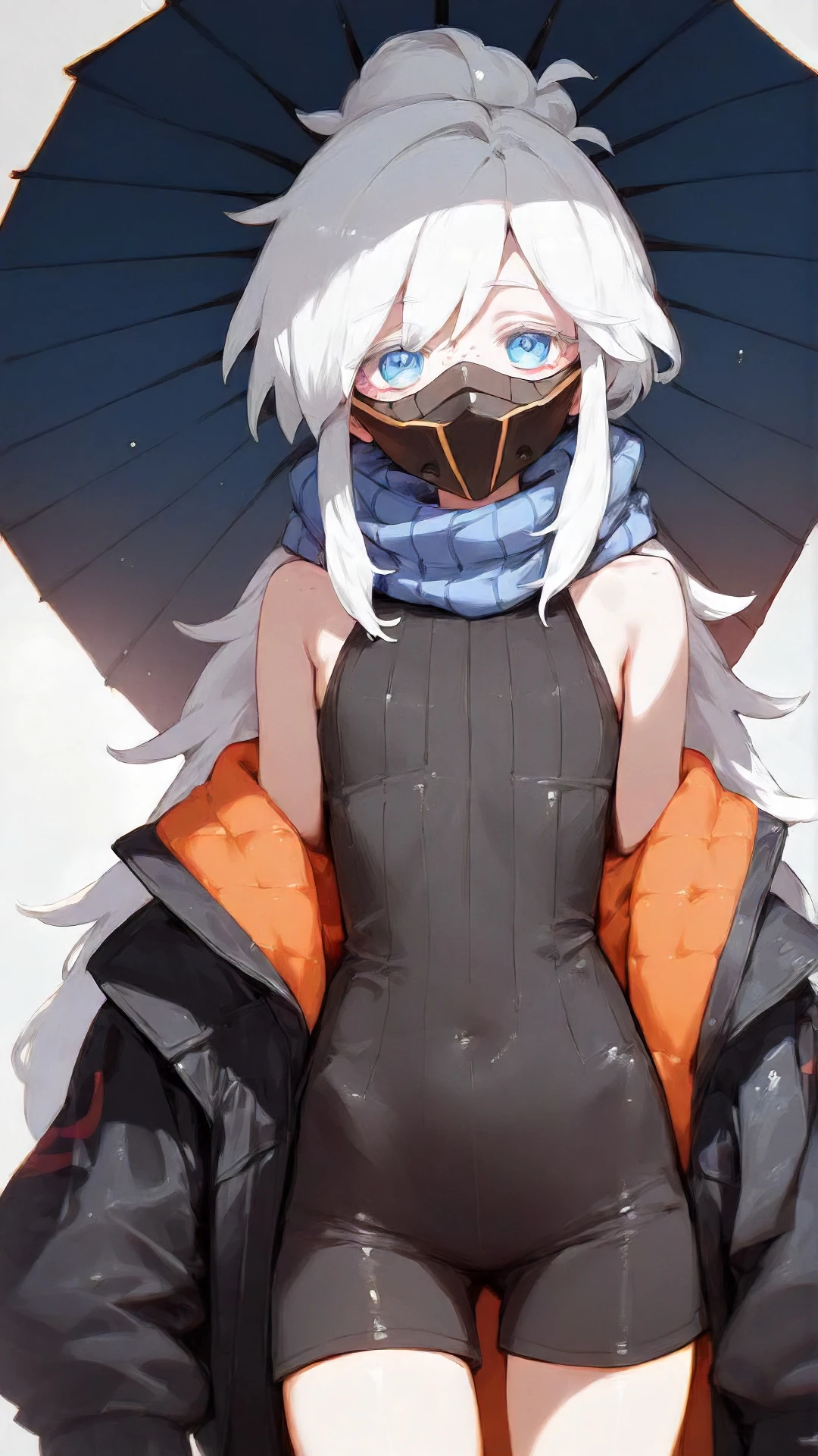deux_murasame, an anime girl, 1girl, solo, looking at viewer, blue eyes, simple background, white background, bow, animal ears, closed mouth, tail, white hair, pantyhose, bowtie, rabbit ears, flat chest, leotard, hand on hip, wrist cuffs, mask, fake animal ears, playboy bunny, rabbit tail, fishnets, bright pupils, white pupils, white leotard, mouth mask, fishnet pantyhose, mask pull, side-tie leotard