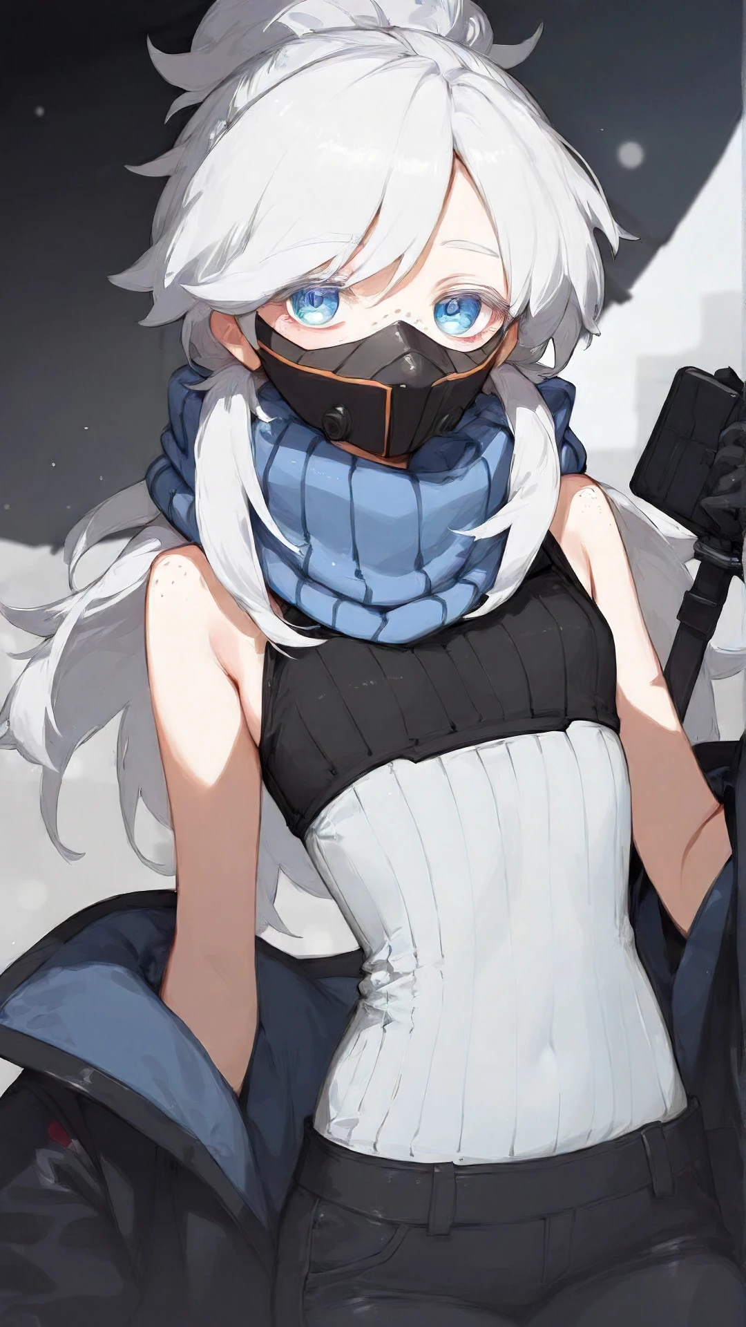 deux_murasame, an anime girl, solo, long hair, looking at viewer, blue eyes, white hair, shoes, sleeveless, pants, armpits, arms up, androgynous, 1other, white skin