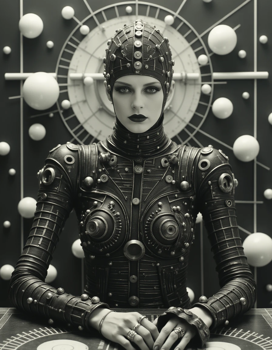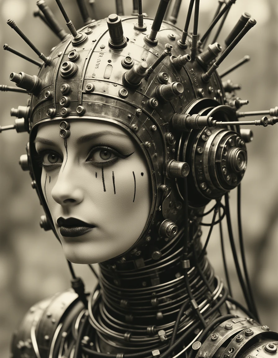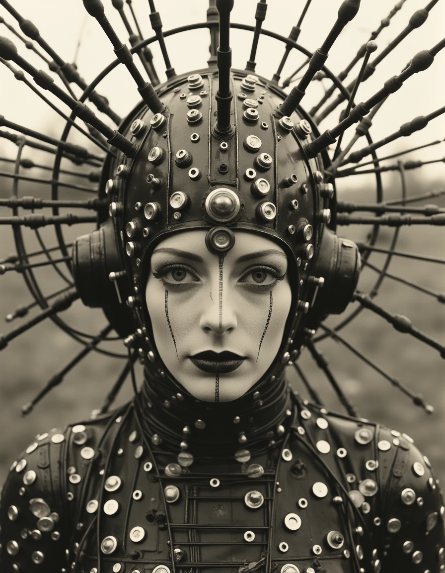 The Weird World style draws inspiration from surreal and avant-garde influences, blending elements of the bizarre with a retro-futuristic aesthetic. This style features mechanical or organic forms integrated with human elements, creating a sense of otherworldliness and uncanny beauty. It often plays with monochromatic or muted color schemes, as seen in the sepia or black-and-white tones that give the image a vintage yet timeless feel. Inspired by artists like Claude Cahun (but no photo of him was used for training) , it emphasizes bold contrasts, intricate details, and symbolic, dream-like imagery. The result is a fusion of technology and identity, where the human form is altered and abstracted in a striking, thought-provoking way.