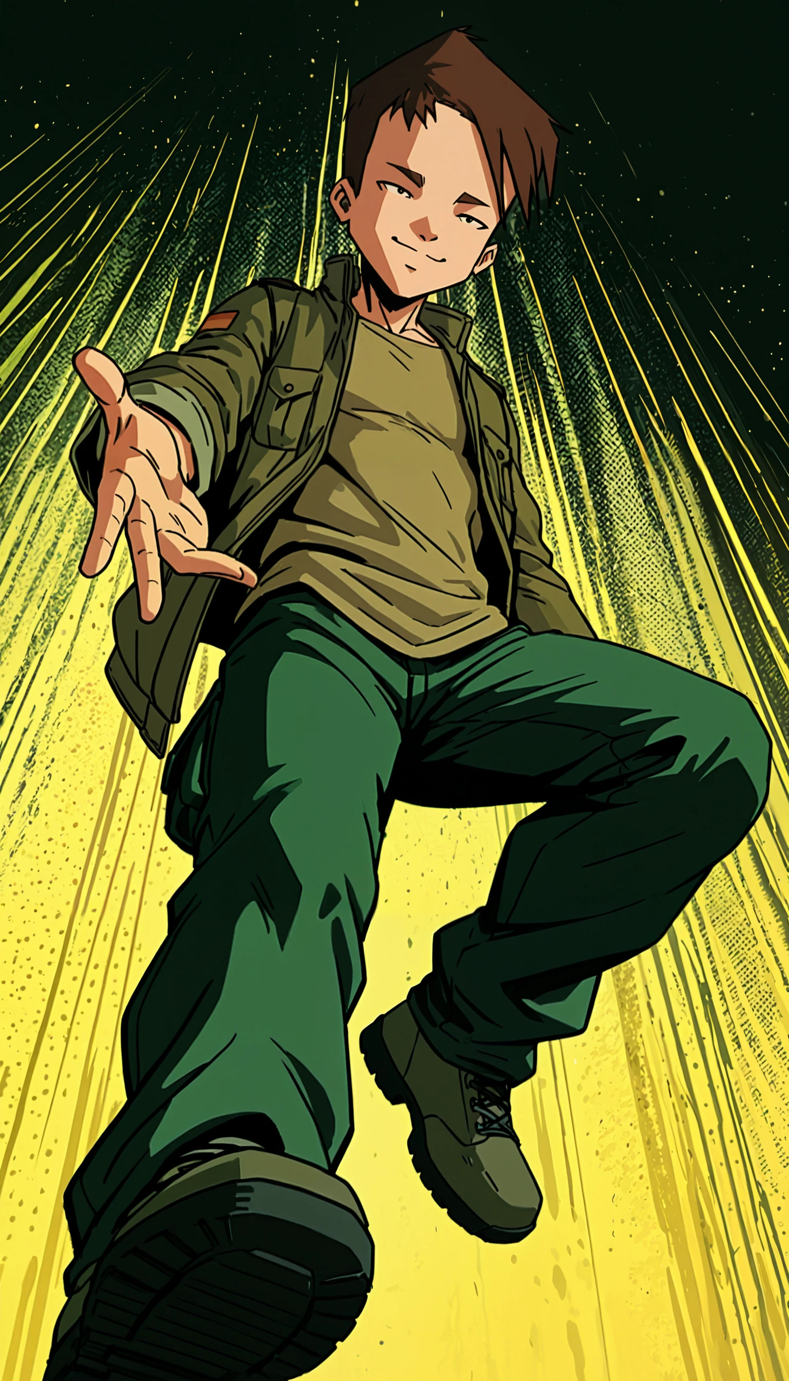 ulrich stern, brown hair, green shirt, green vest, cargo pants