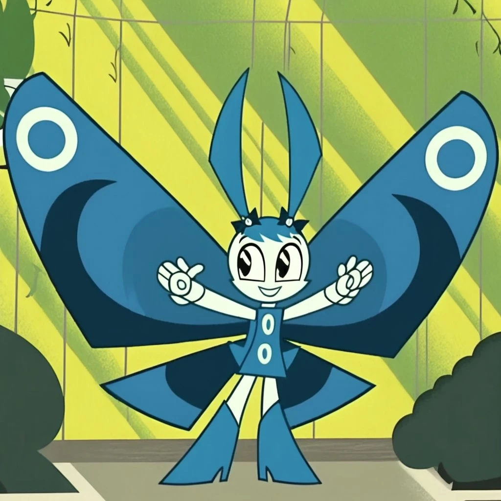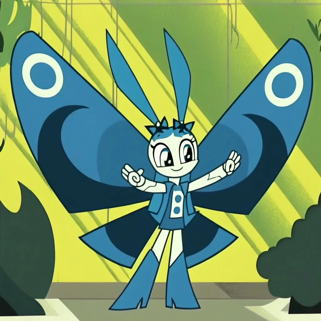 butterfly jenny, jenny wakeman, 1girl, solo, robot joints, black eyes, blue hair, white skin, blue button up dress, blue high heel boots, blue butterfly wings, long hair, parted hair, twintails, hair bows