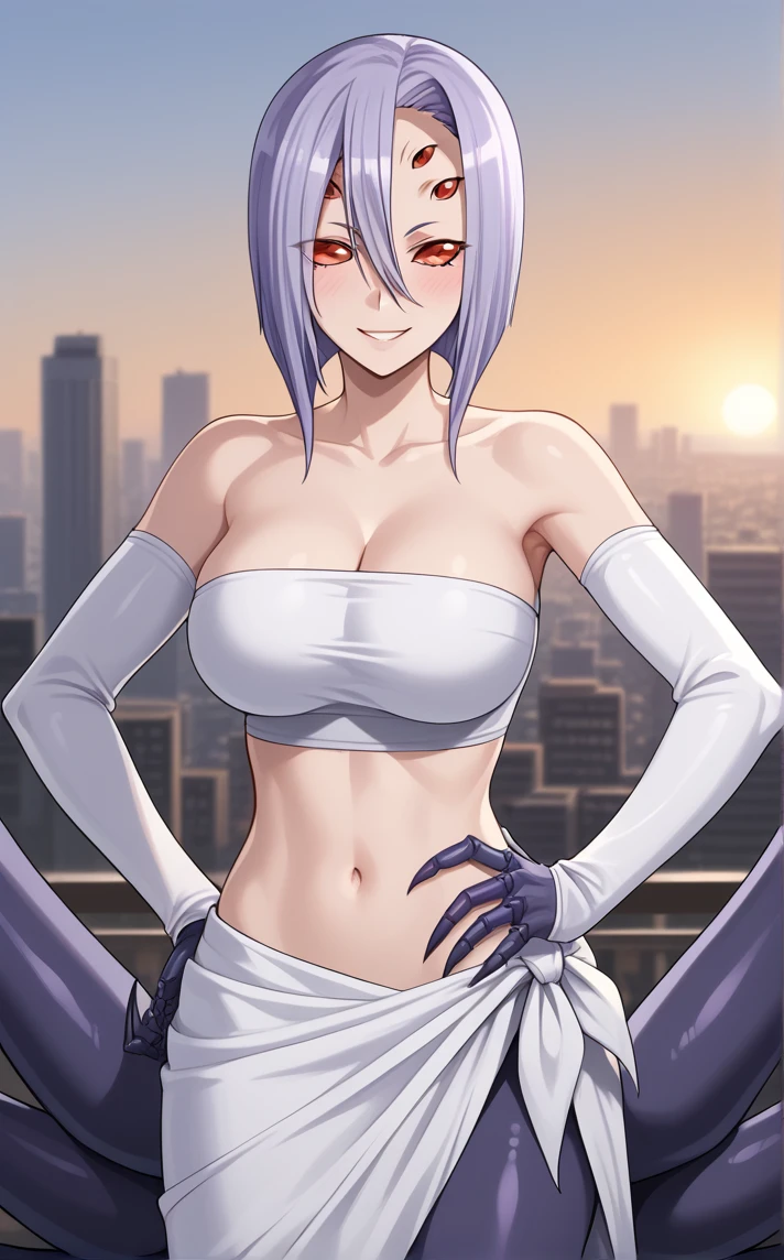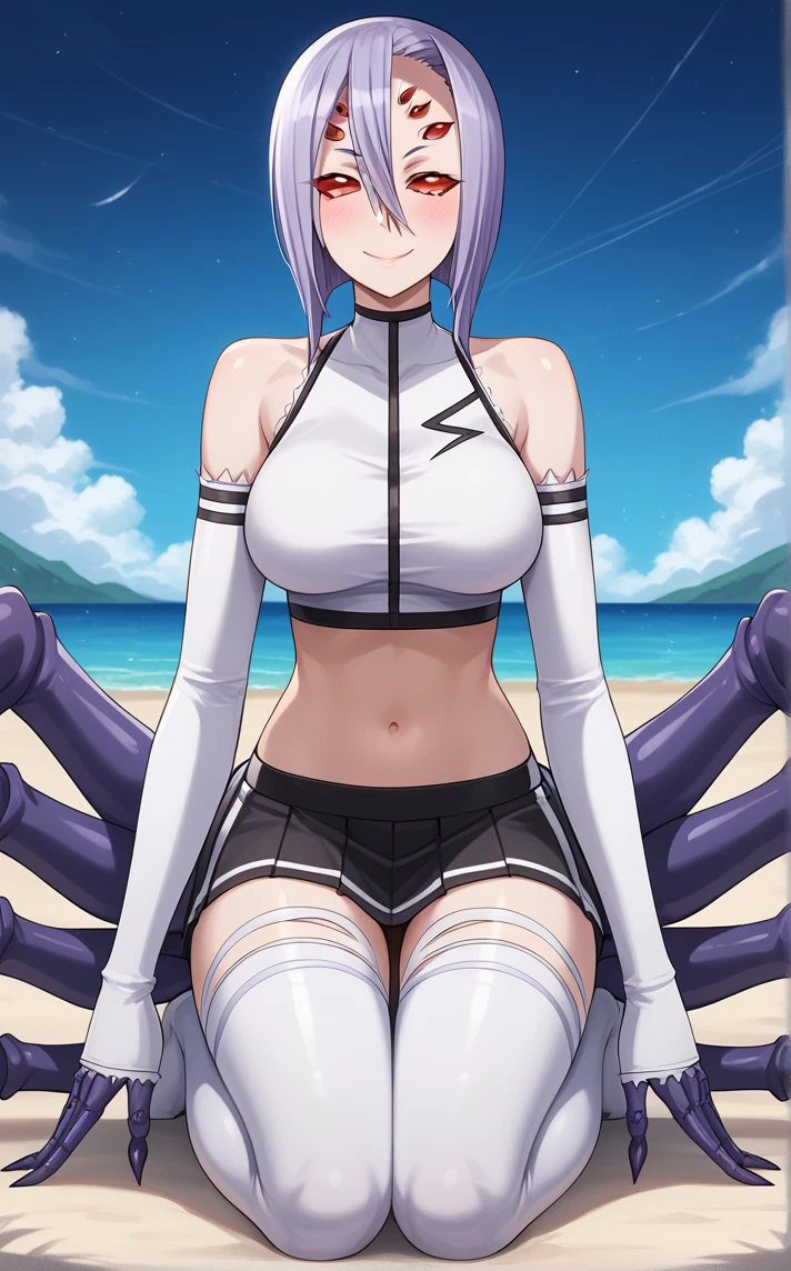 MainOutfit_RachneraArachnera_ownwaifu, 1girl, arachne, arthropod girl, carapace, extra eyes, furry, light purple hair, monster girl, red eyes, short hair, spider girl, taur, multiple legs, bare shoulders, detached sleeves, hair between eyes, claws, large breasts, underboob, solid eyes, navel, pelvic curtain, midriff, silk, elbow gloves, cleavage, eyes visible through hair, collarbone, no pupils, black sleeves, tall female, bangs, black gloves, sleeveless, arthropod limbs, crop top, skirt, bob cut, clothing cutout, colored skin, halterneck, medium hair, choker, gold trim, loincloth, strapless, underboob cutout,