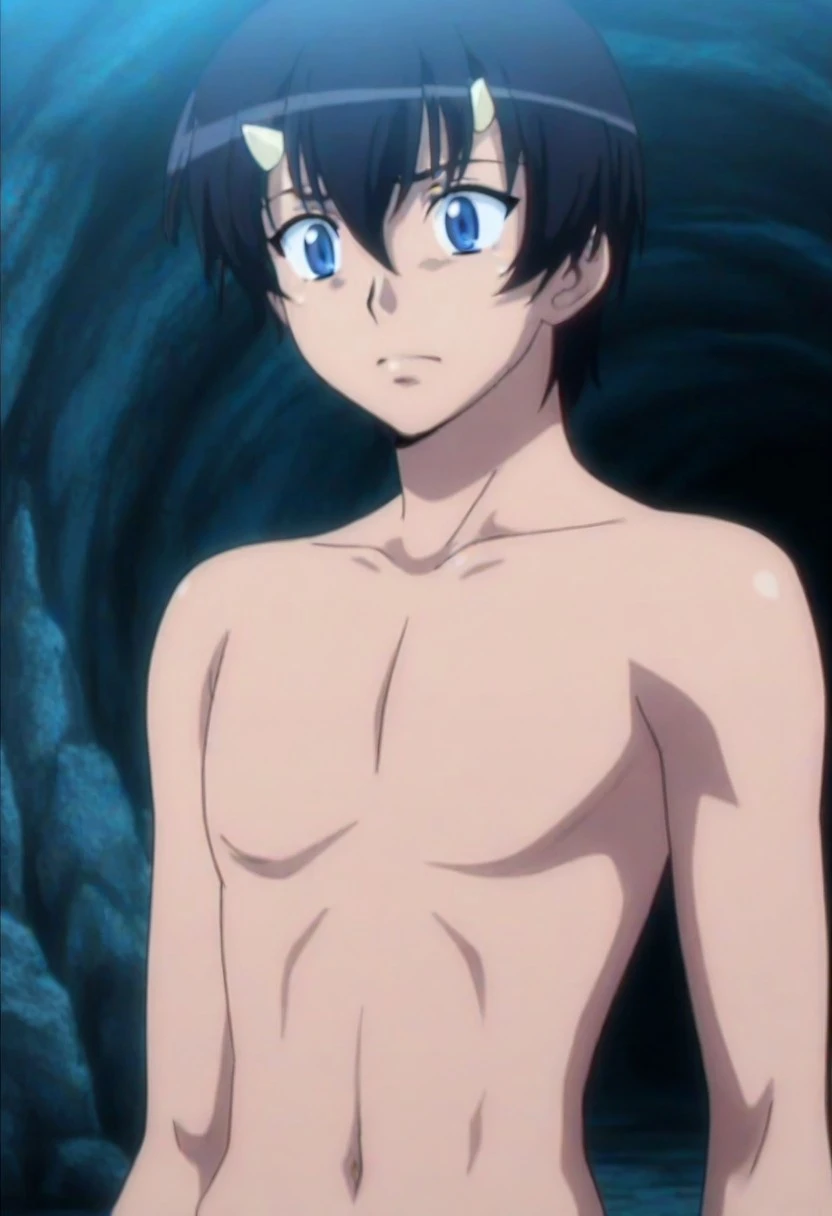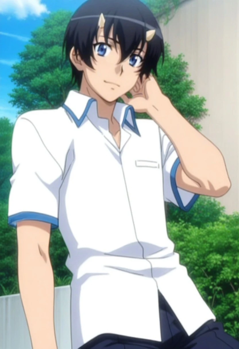 Ichirou Tachibana, black hair, ahoge, two small horns, blue eyes, white collared shirt, short sleeves, untucked shirt, black-blue pants