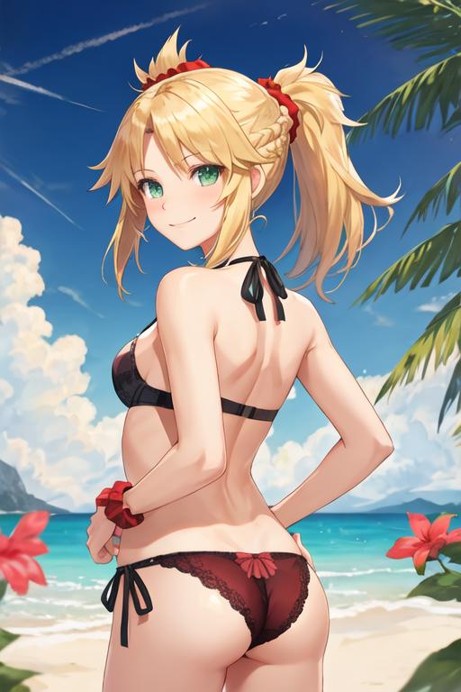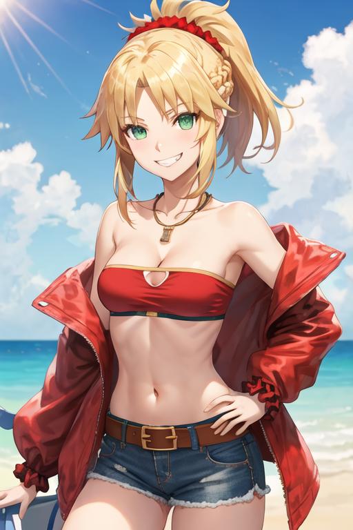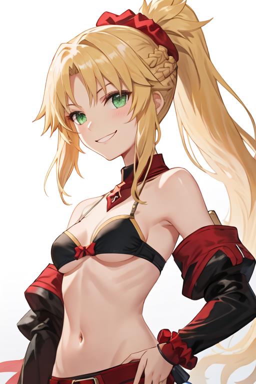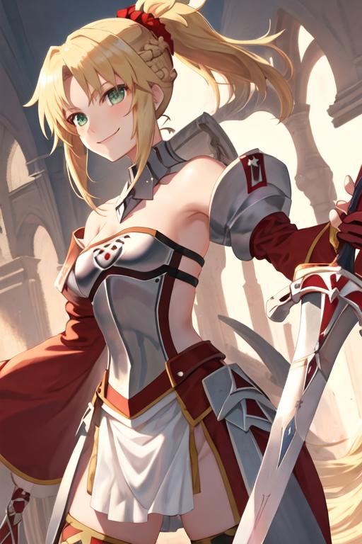 The trigger word is mordred_fgo, and the recommended tags are best quality, masterpiece, highres, solo, {mordred_fgo:1.15}, blonde_hair, long_hair, ponytail, green_eyes, braid, scrunchie, hair_ornament, red_scrunchie, bangs, hair_scrunchie, breasts, smile, small_breasts.