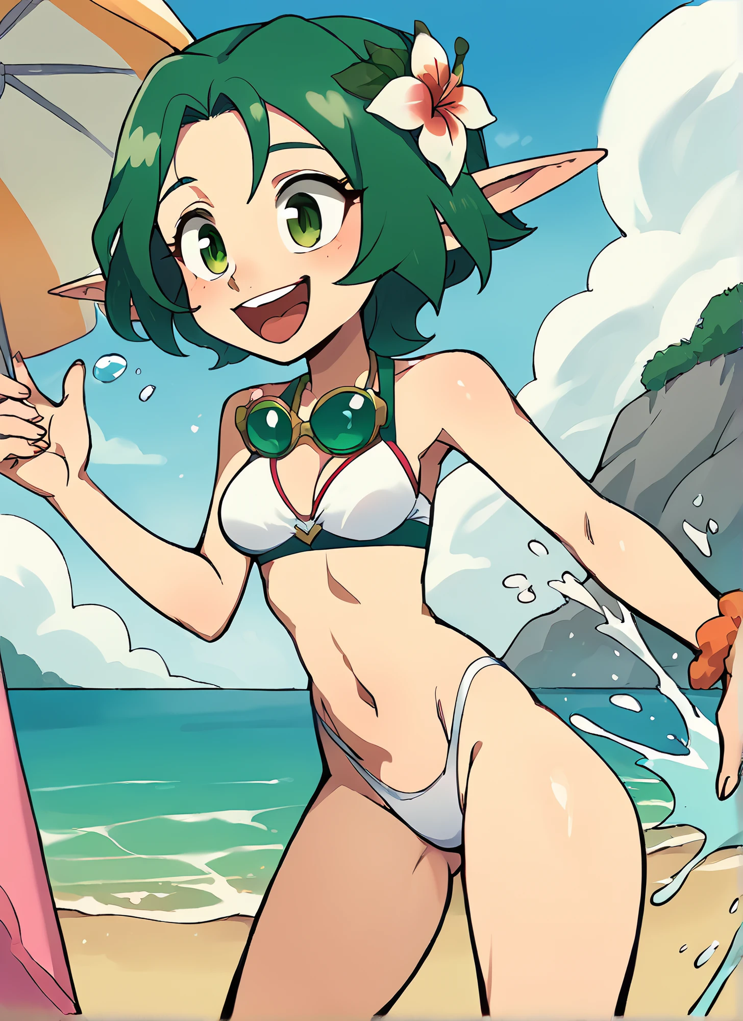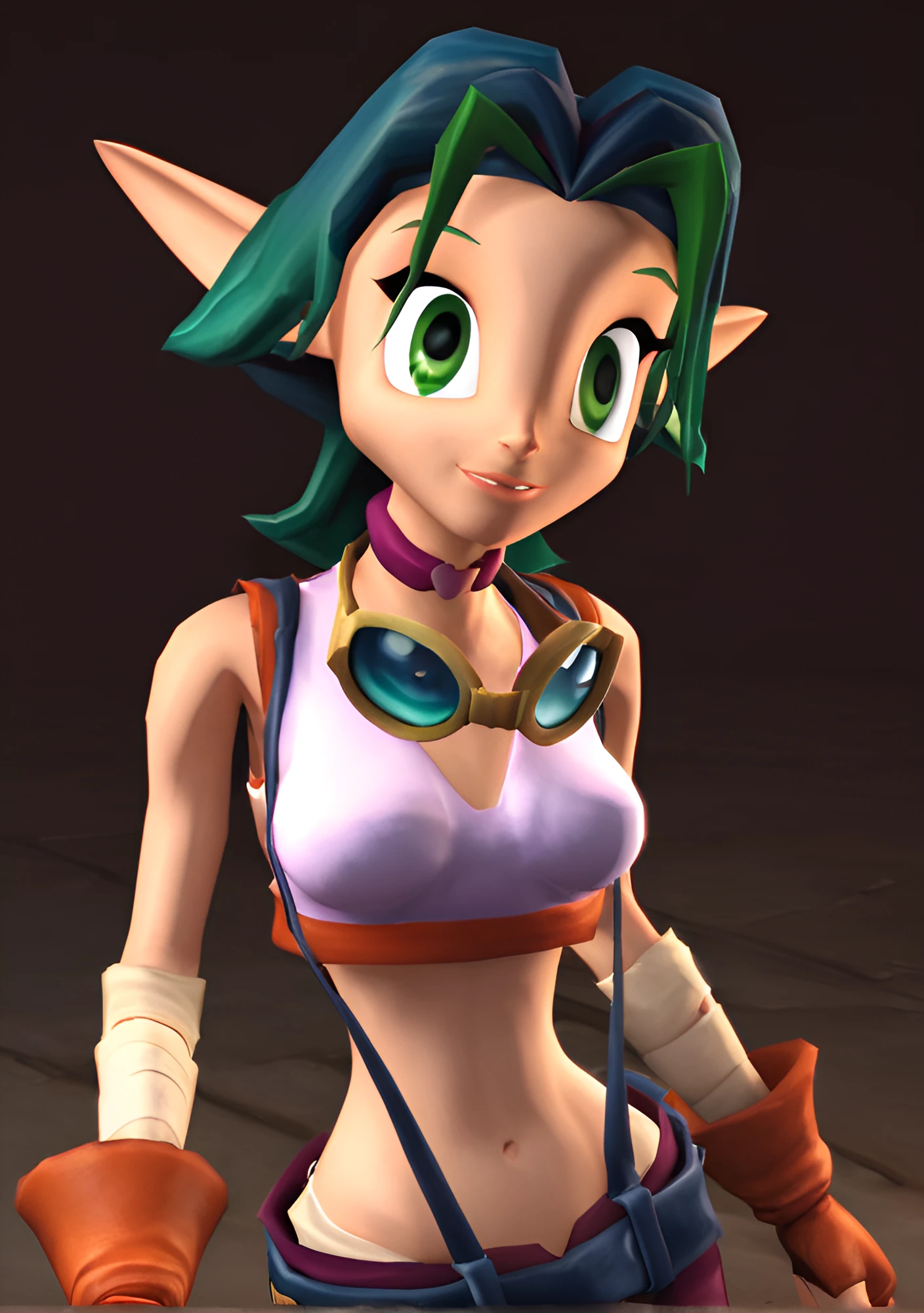 Worth noting that Keira had a different design in the first game then switched to a new one from Jak 2 onwards. I marked relevant shots under "Jak 1 design" and "Jak 2 design". The former is more stylized and cartoony with bigger eyes and the like, while the latter is more realistic and detailed, so it might be worth specifying one based on the art style you're going for.