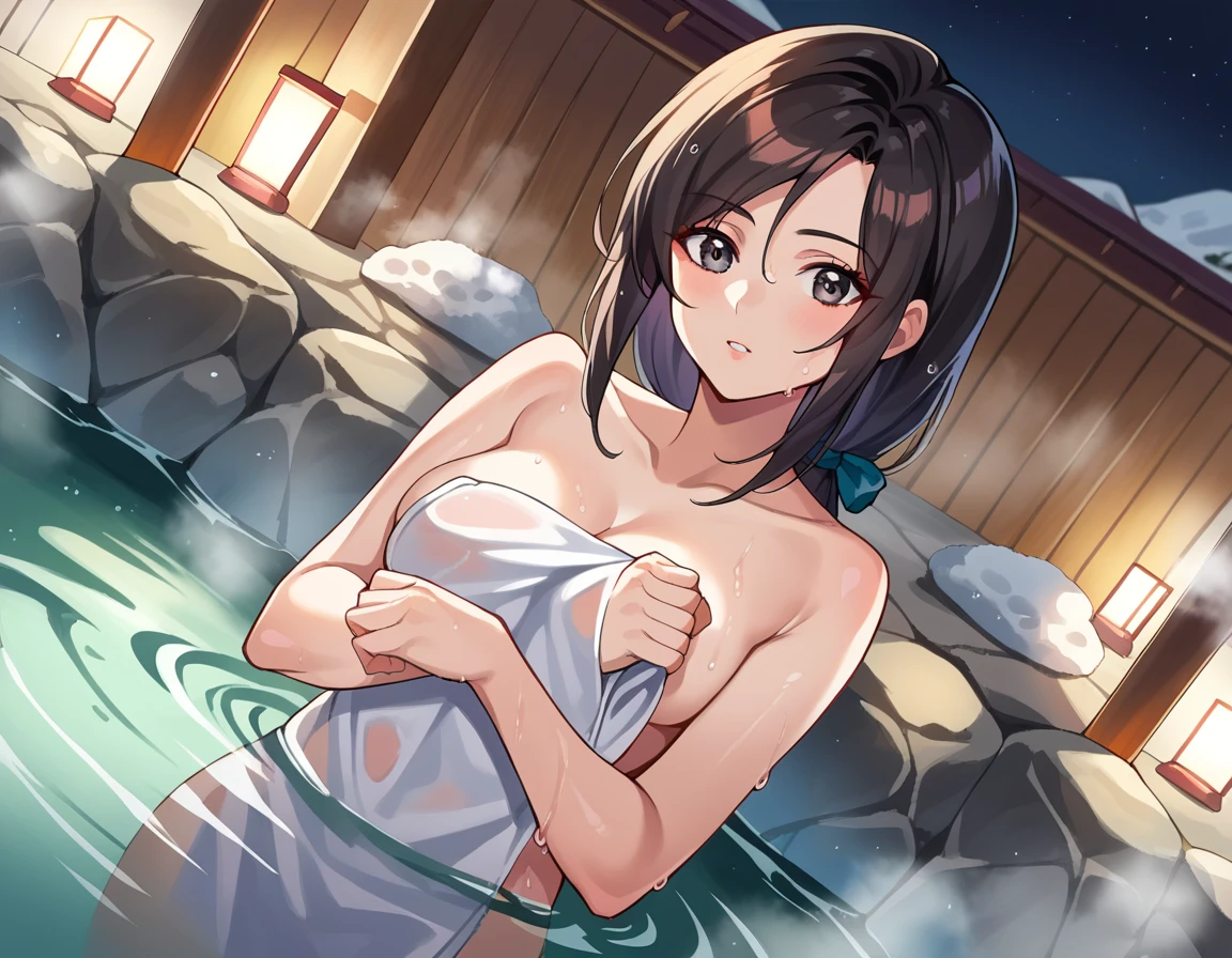 garnet, grey eyes, long hair, black hair, low-tied long hair, swept bangs, hair ribbon,