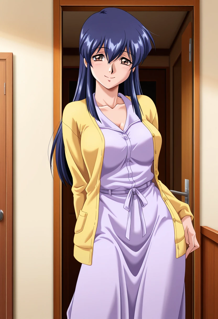 yellow cardigan, purple dress, long dress,