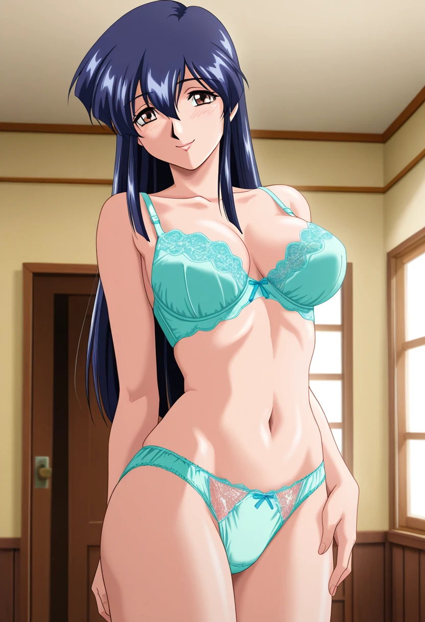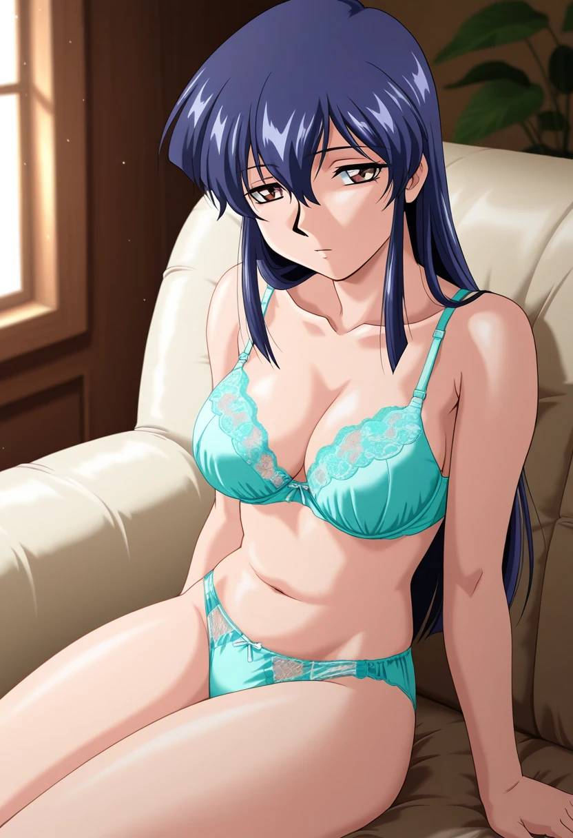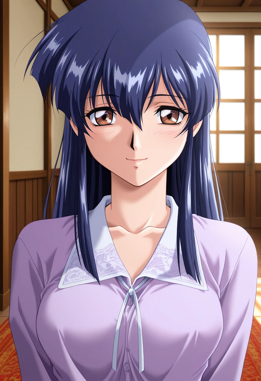 rieww, mature female, brown eyes, blue hair, long hair, hair between eyes, medium breasts,