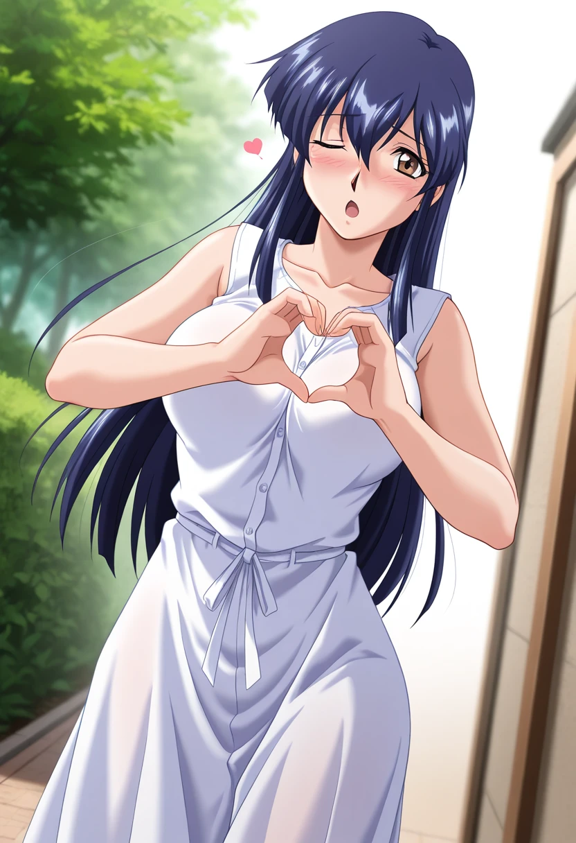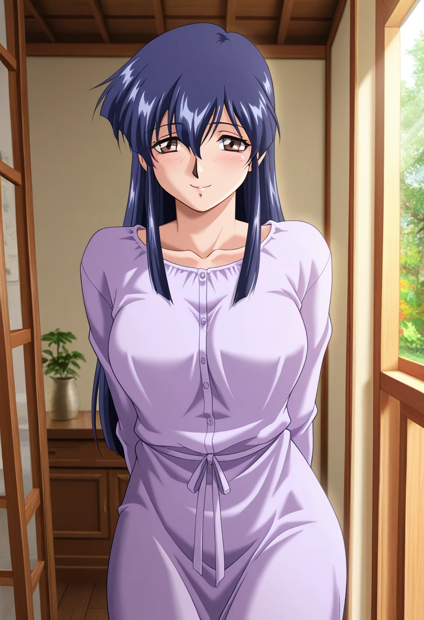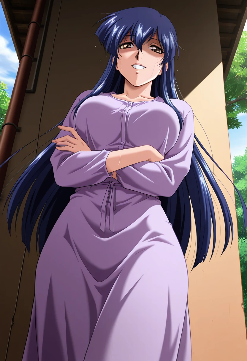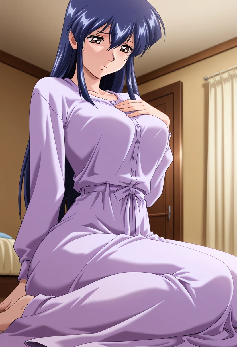 rieww, mature female, brown eyes, blue hair, long hair, hair between eyes, medium breasts,