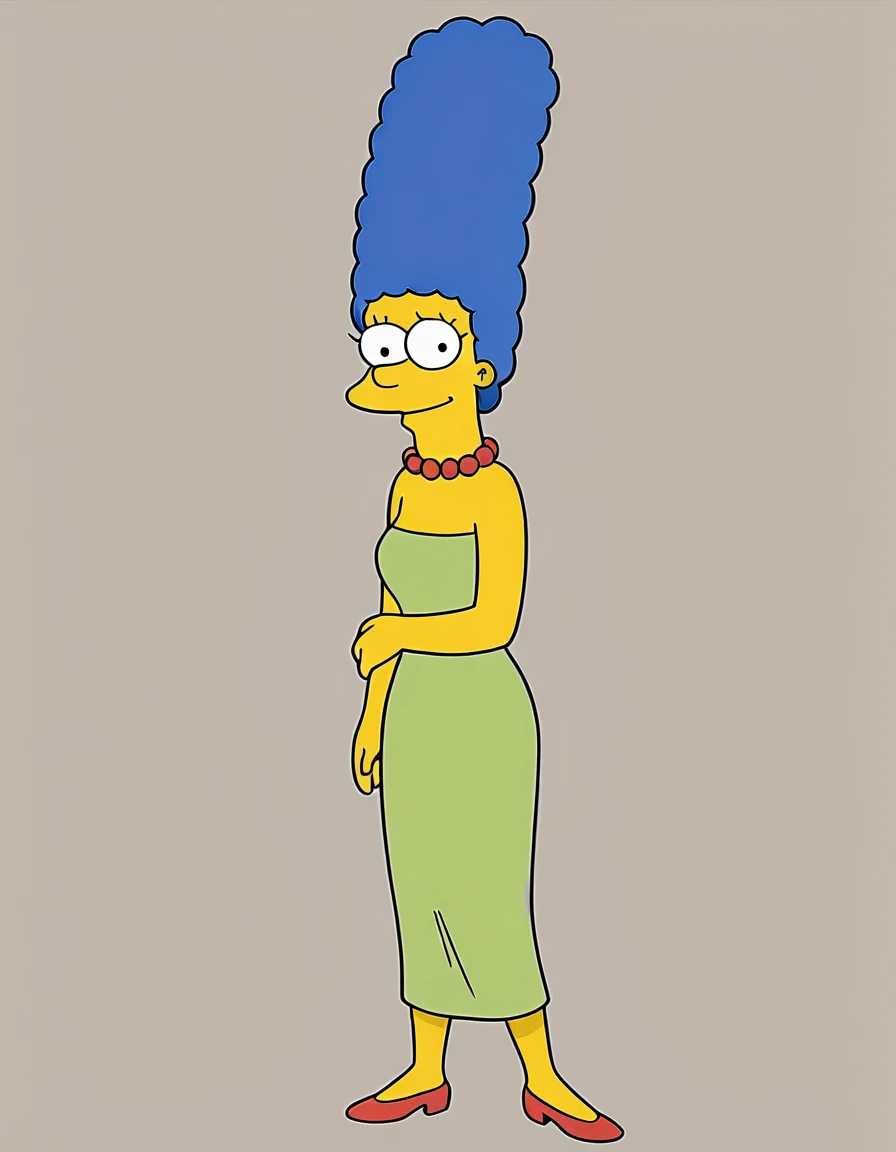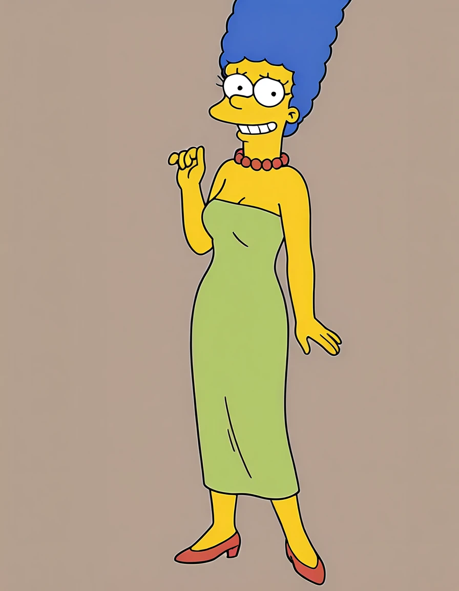 marges, blue hair, 1girl, solo, yellow skin, pearl necklace,green dress, smile,red footwear