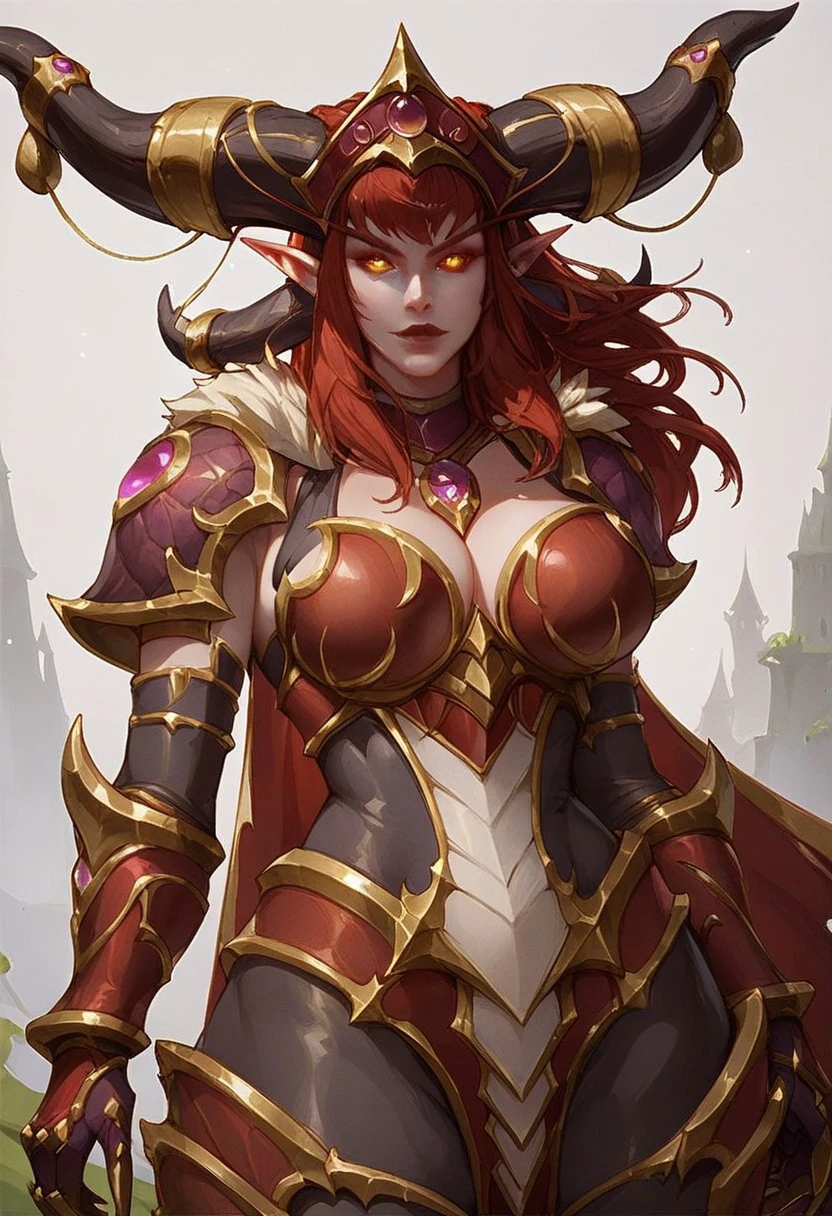 alexstrasza, 1girl, horns, horn ornament, red hair, long hair, pointy ears, yellow eyes, armor, cape, gauntlets, jewelry,
