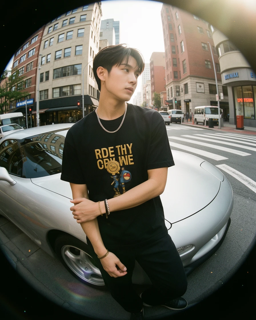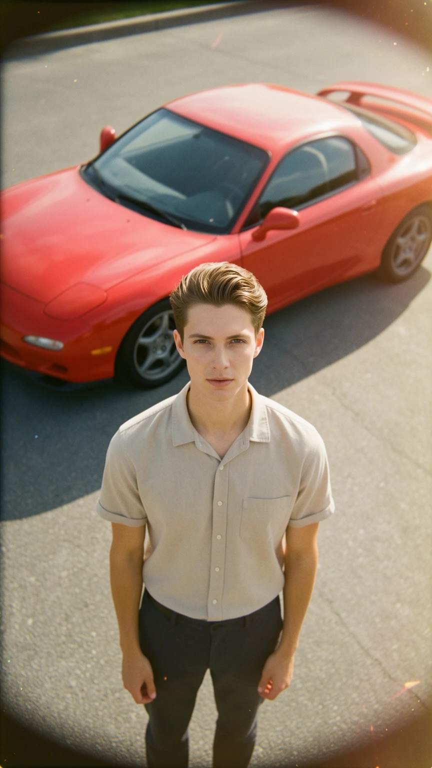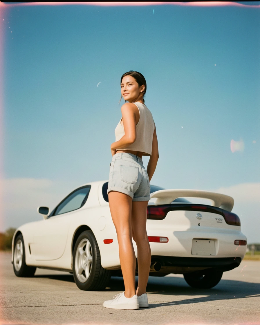Likes to give the front wheel 6 fingers while the rear mostly gets 5. Strength of .7 with 16 steps seems like a good starting point. It gets warpy/stretched as you go higher strength .9+, and with lower strengths like .3 it morphs into other cars or modded. If you're adding a person I find adding "tall" helps size them better "photo of a tall model leaning on a RX-7".