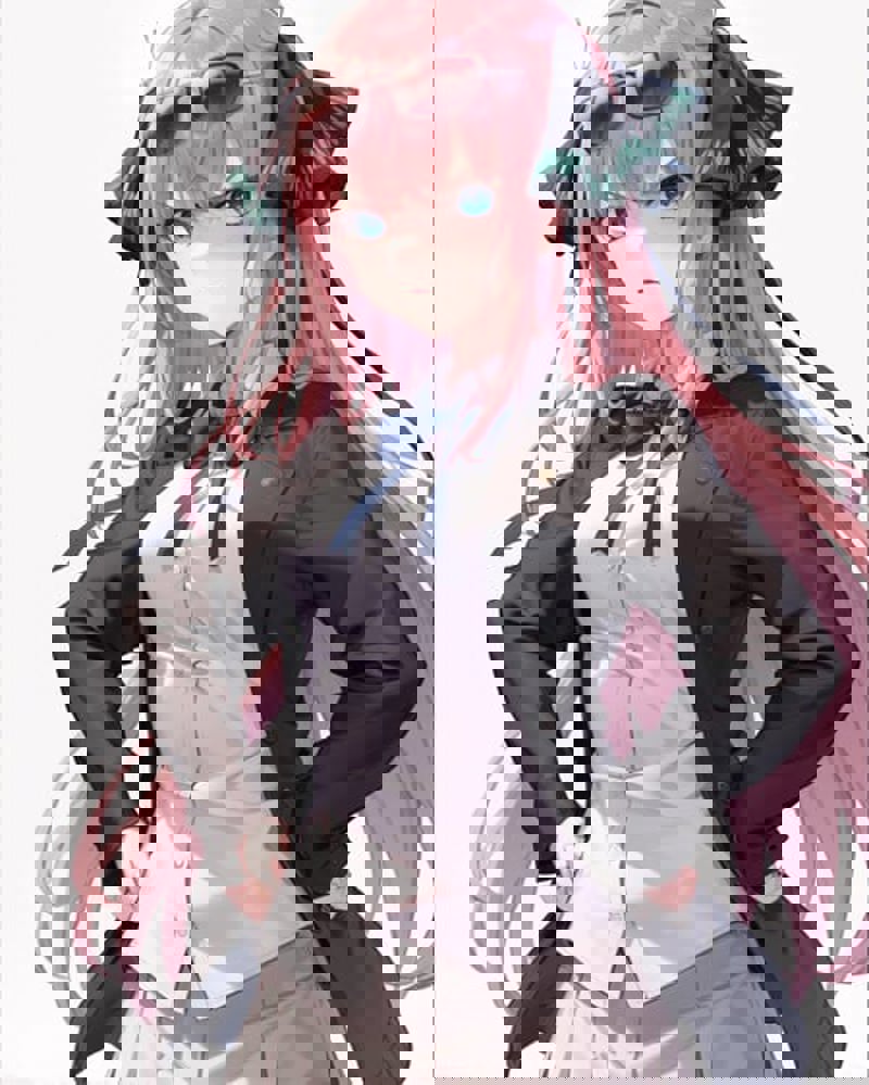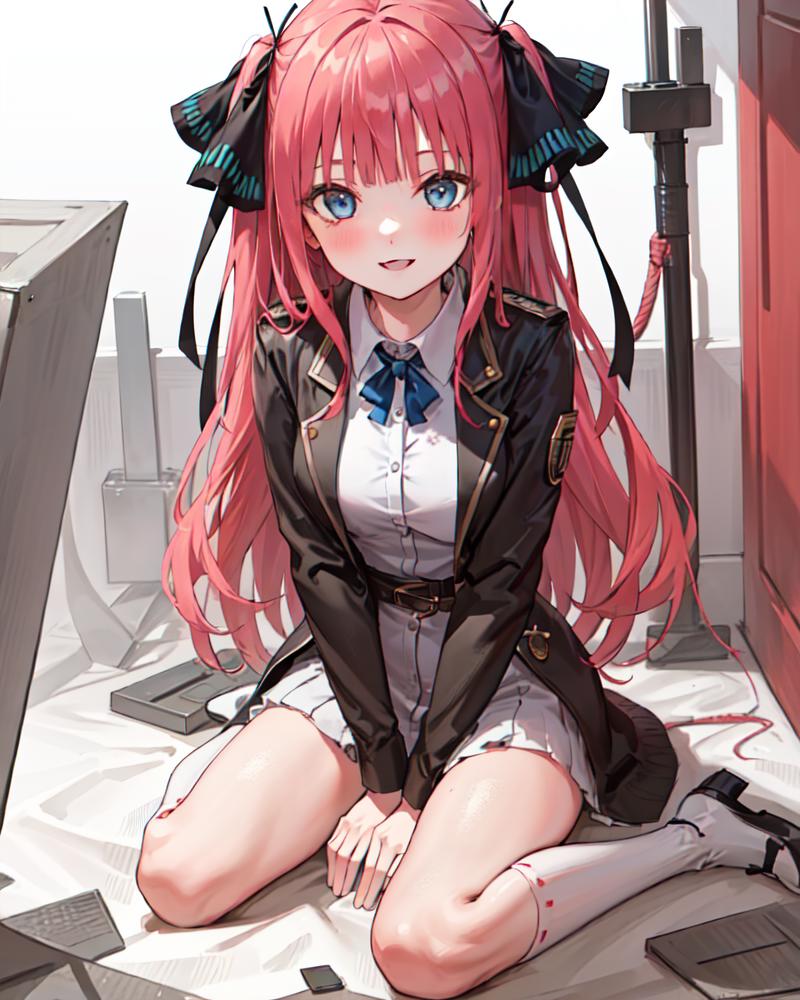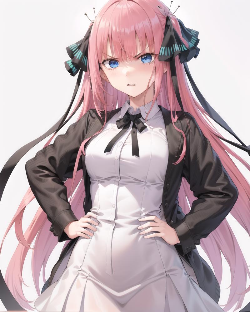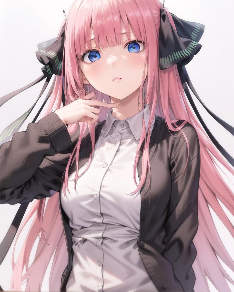 nakano_nino,shirt, ribbon, long_hair, blunt_bangs, blue_eyes, pink_hair, hair_ribbon, long_sleeves, bangs, hair_ornament,