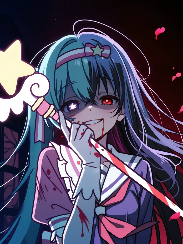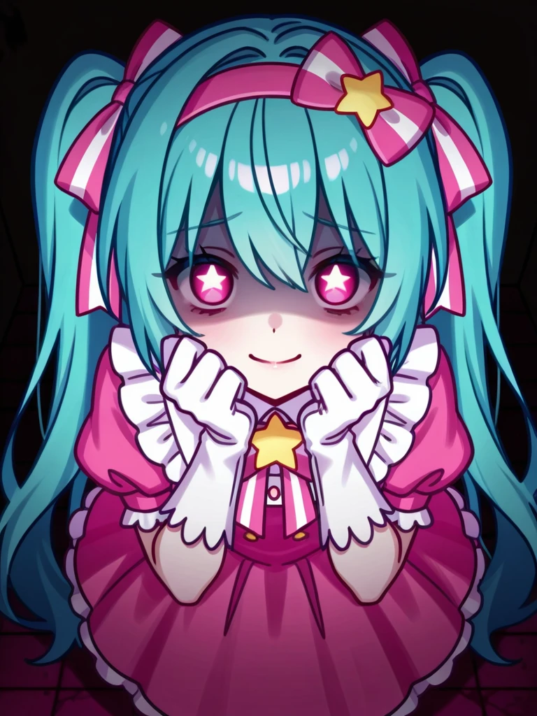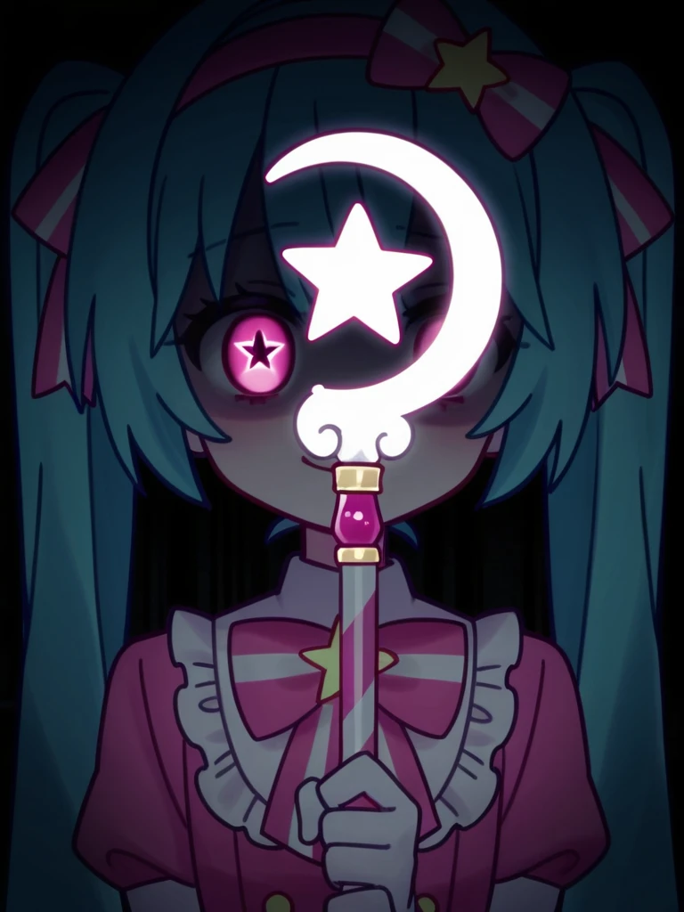 <lora:Mikuagic-10:1>mikuagic, 1girl, solo, bow, long hair, gloves, dress, ribbon, twintails, hair ribbon, aqua hair, pink bow, striped bow, hair bow, pink dress, pink ribbon, striped ribbon, short sleeves, frills, hairband,, (star pupils),(wand:1)