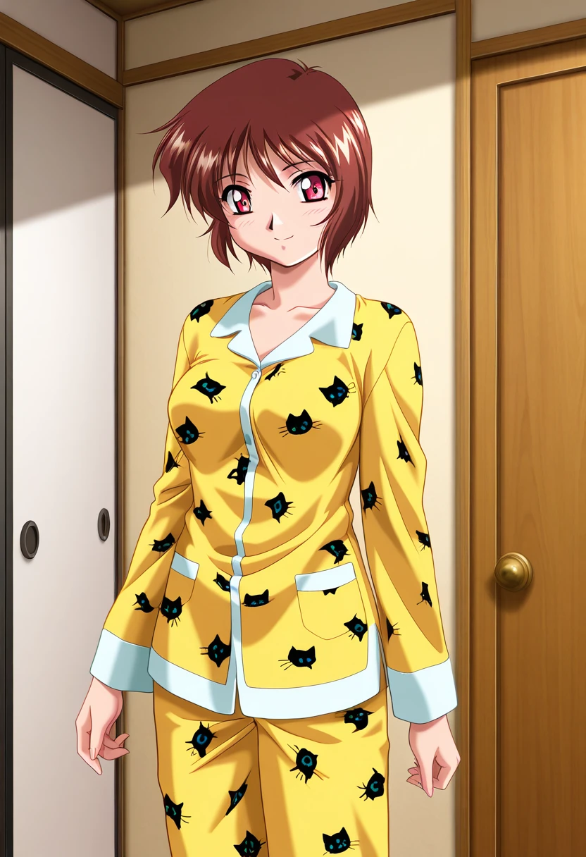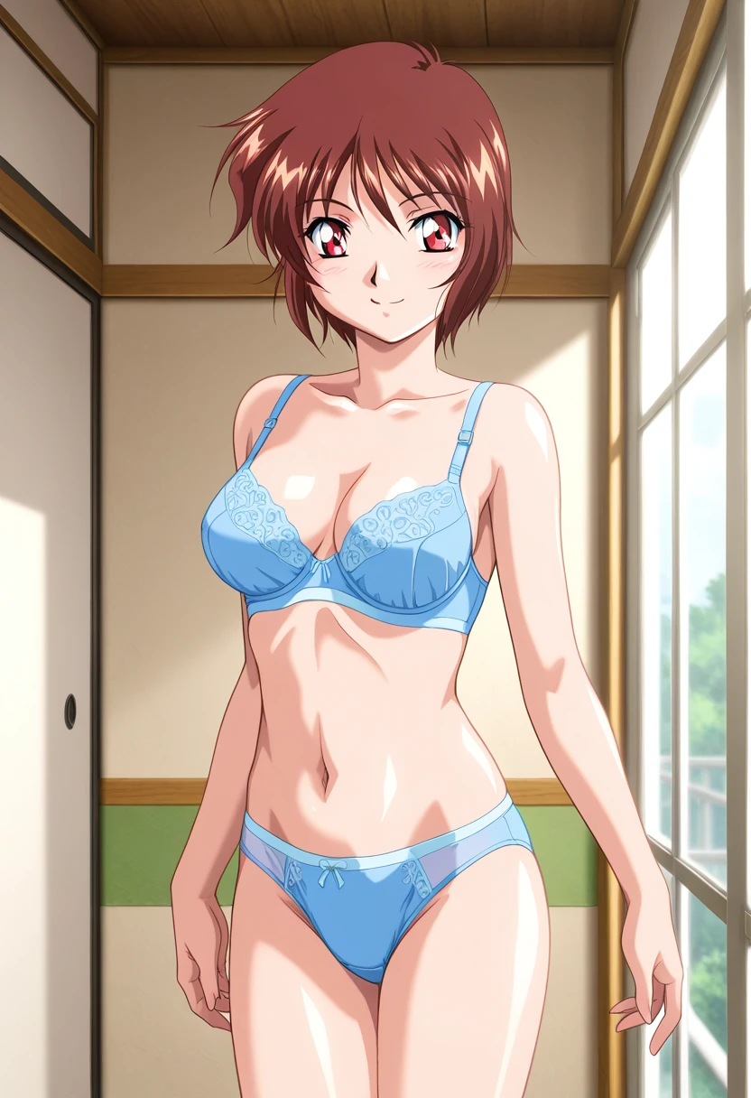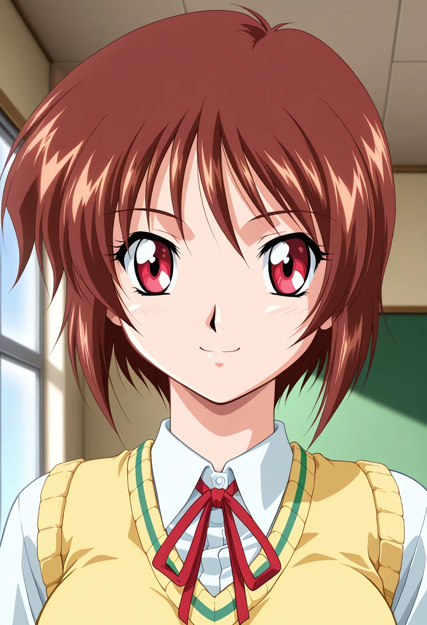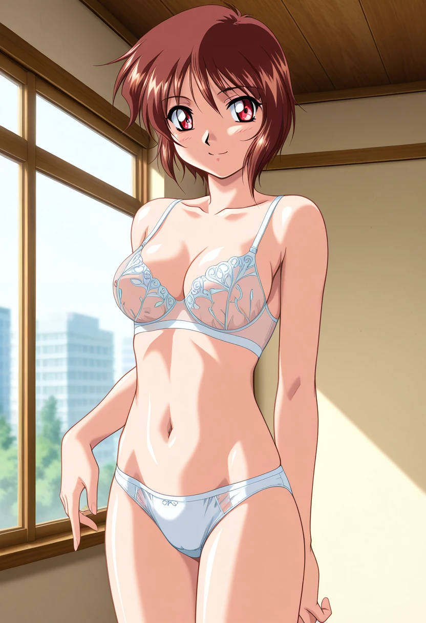 chihayaww, red eyes, brown hair, short hair, medium breasts,