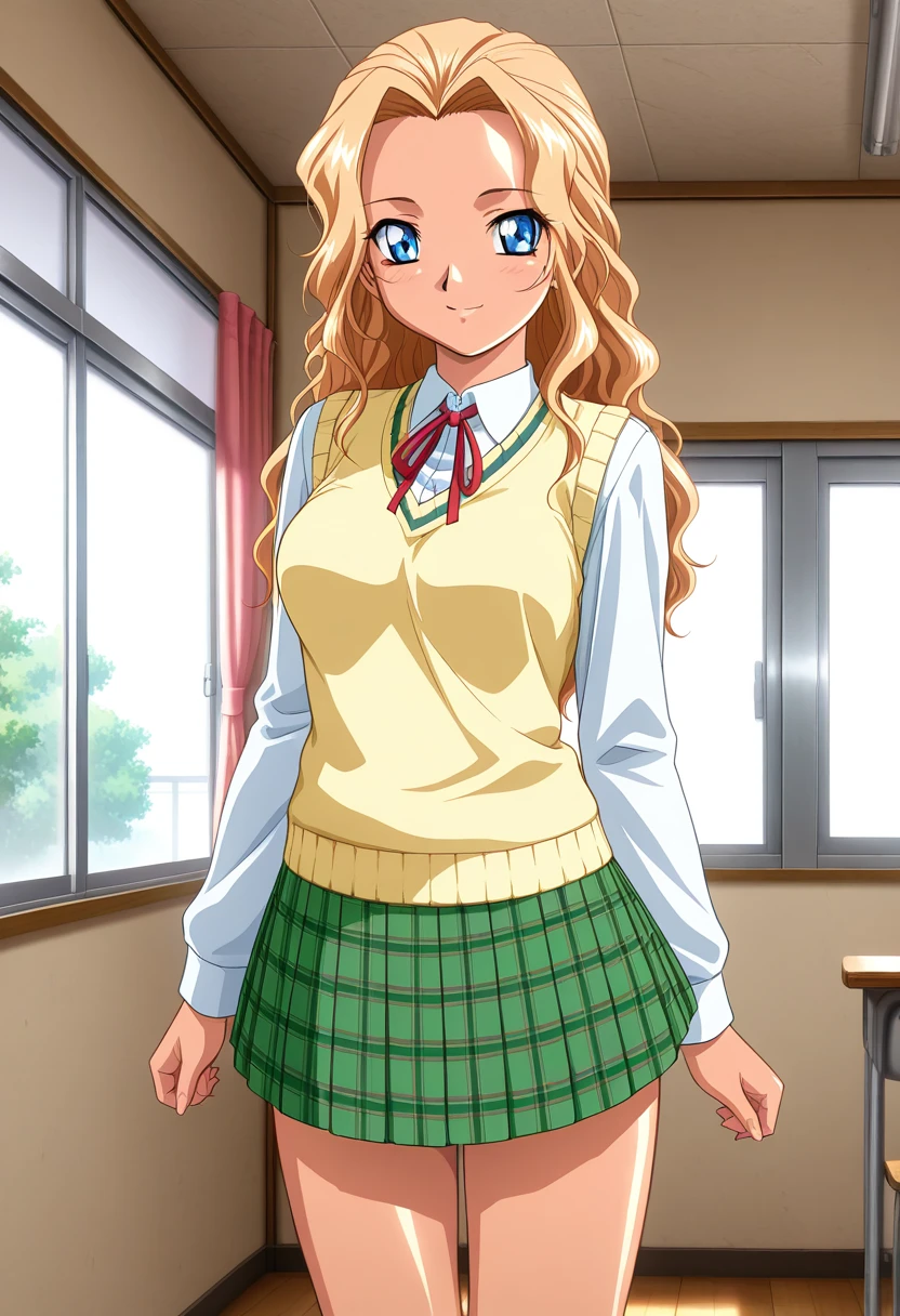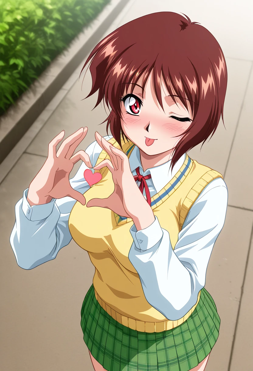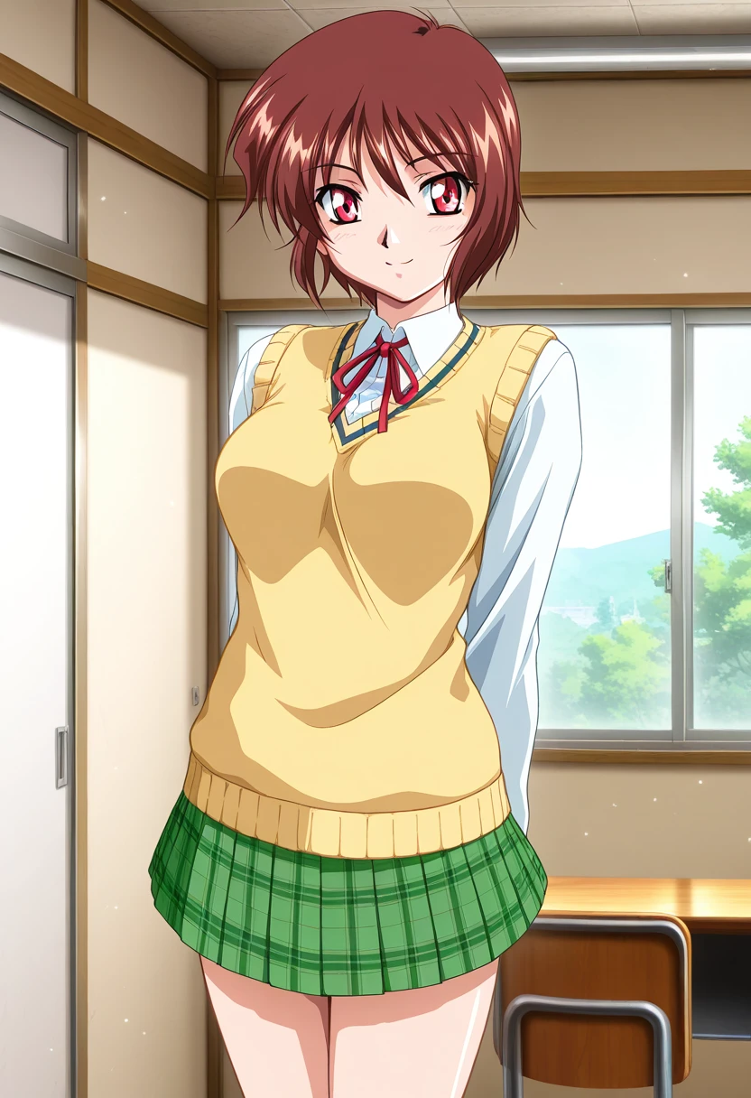 school uniform, red neck ribbon, yellow sweater vest, white collared shirt, long sleeves, green pleated skirt, plaid skirt, miniskirt,