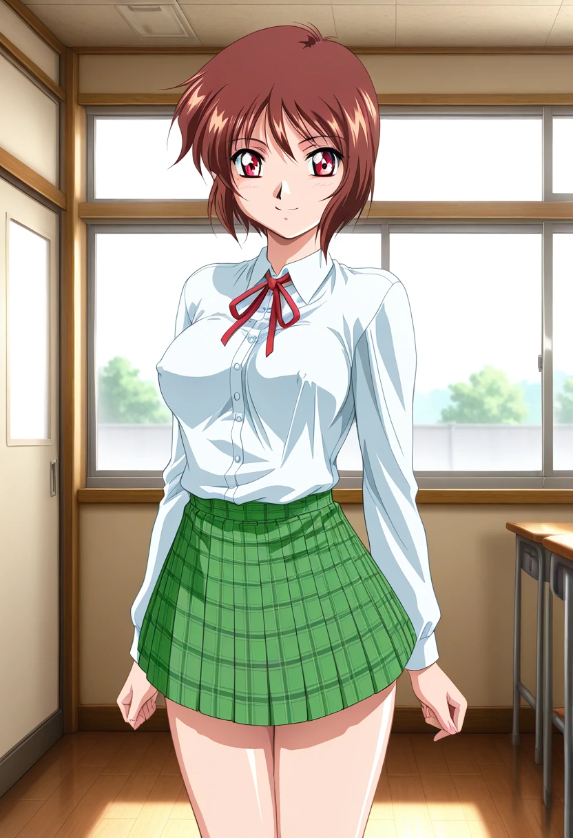 school uniform, red neck ribbon, covered ???????, white collared shirt, long sleeves, green pleated skirt, plaid skirt, miniskirt,
