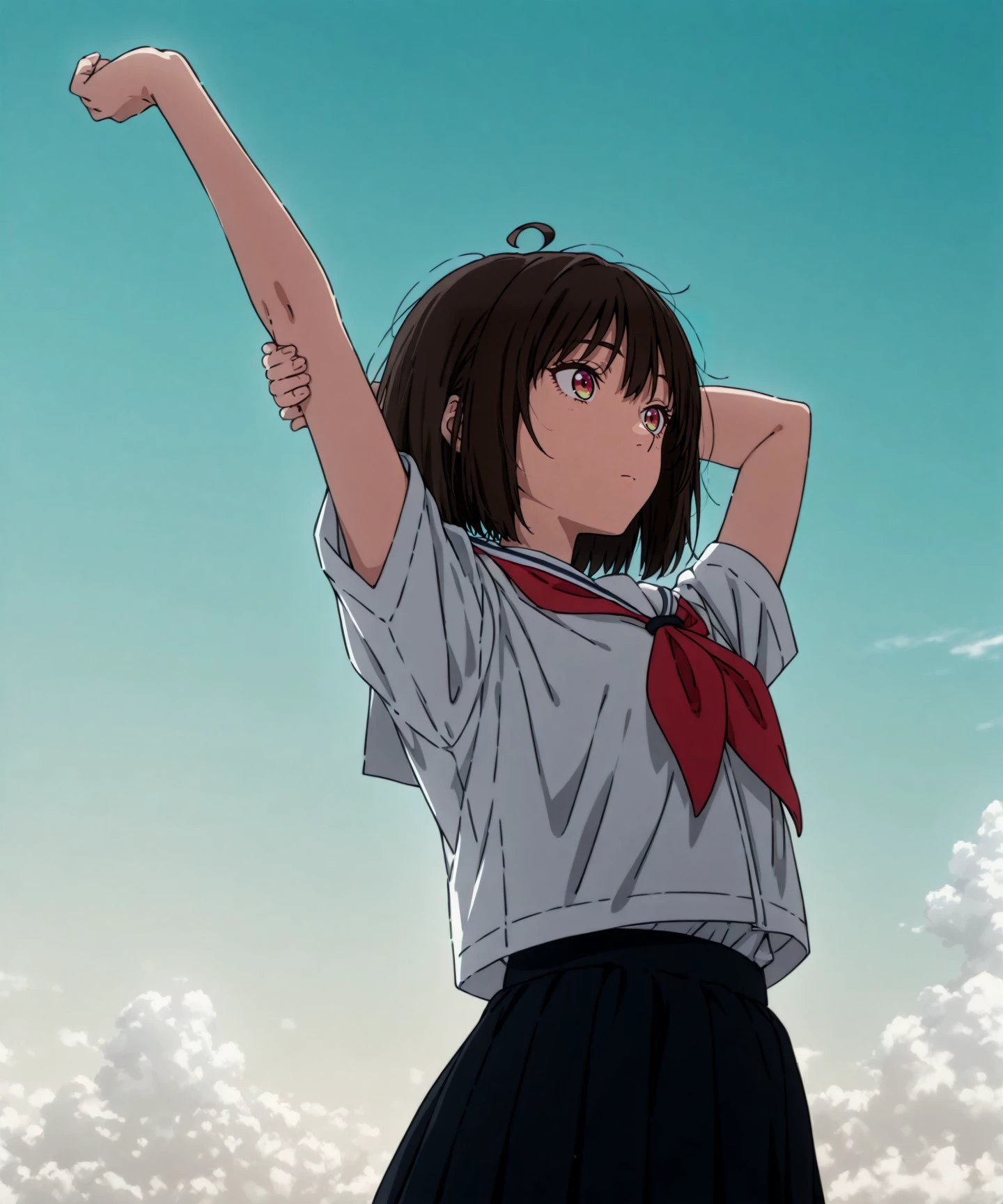 osanai yuki, yuki's eyes, brown hair, short hair, ahoge, white sailor collar, white shirt, short sleeves, red neckerchief, black skirt, uwabaki