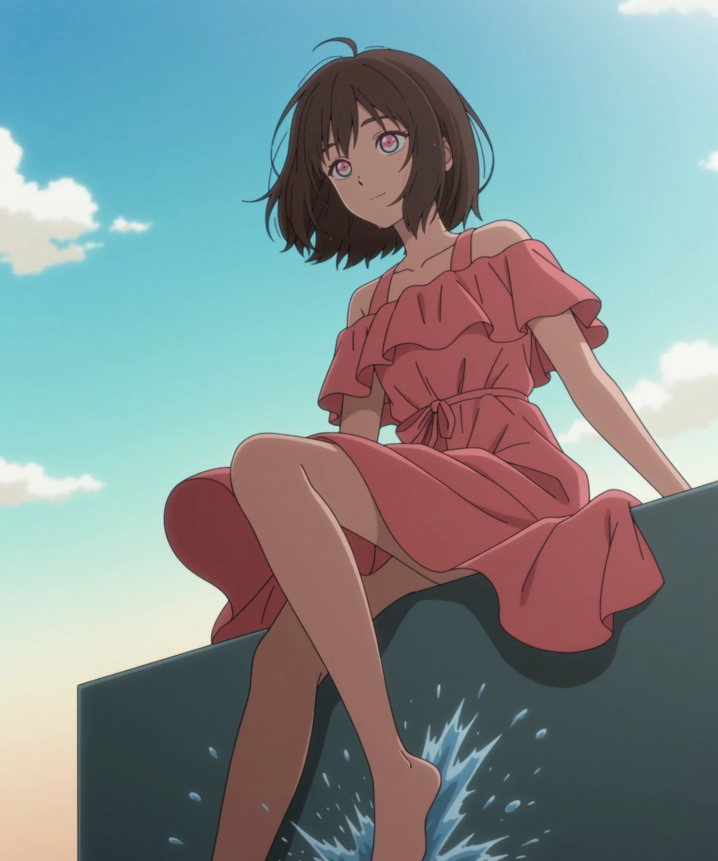 osanai yuki, yuki's eyes, brown hair, short hair, ahoge, pink dress, off-shoulder dress, pink strap, short sleeves, pink shoulder strap, collarbone, white sandals