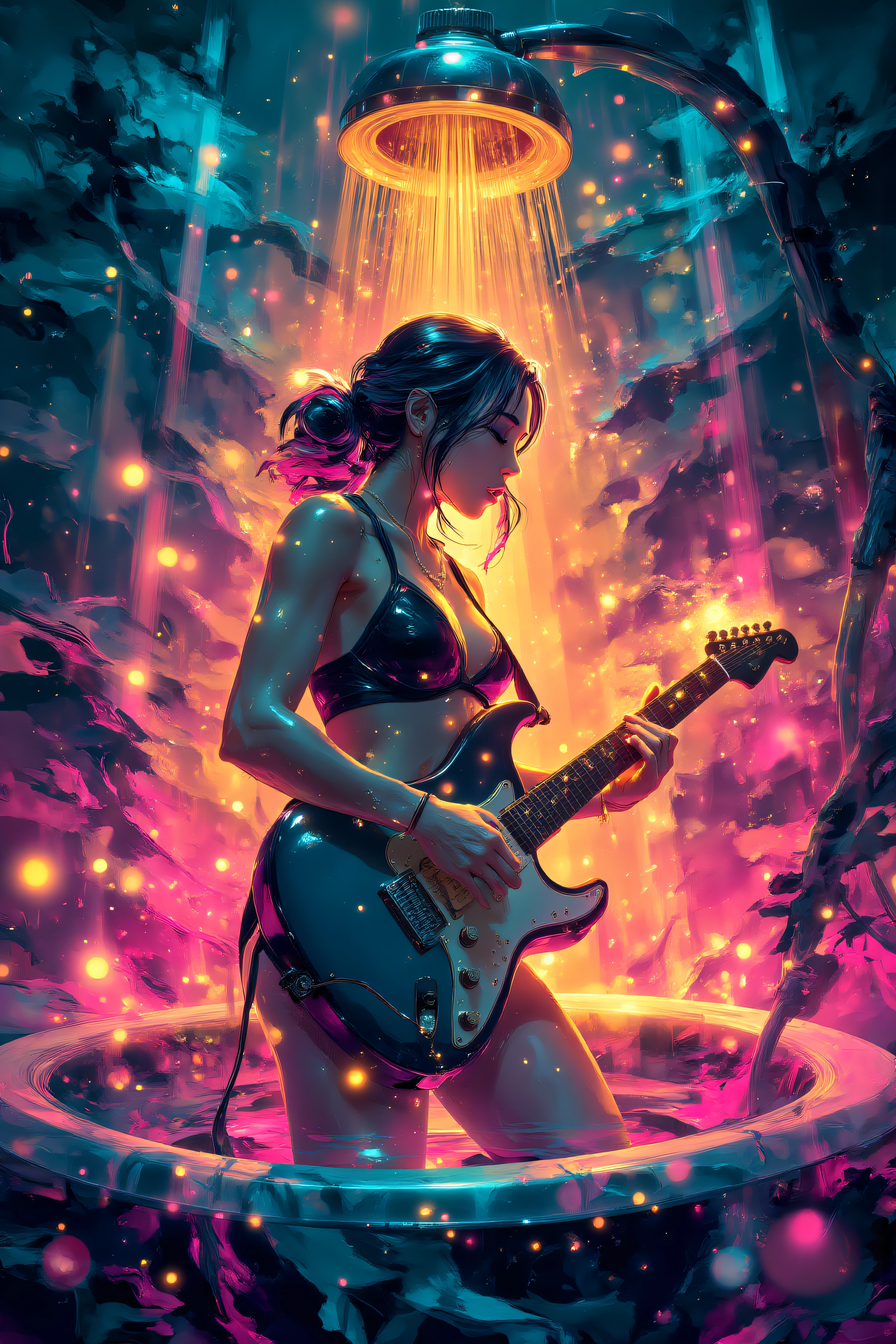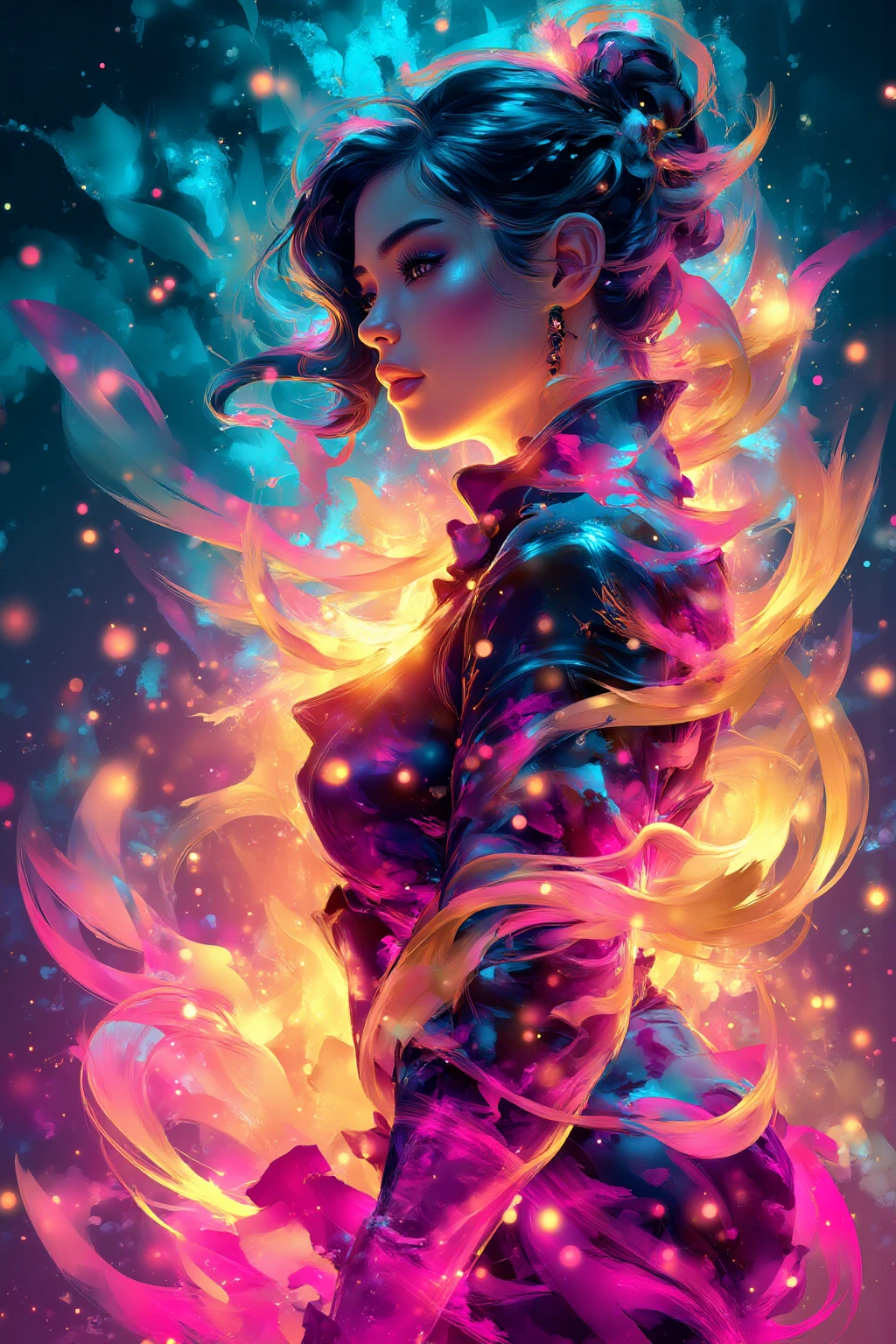 oriental-fantasy-illustration style. Oriental fantasy illustration, surreal dreamlike painting, glowing brushstrokes, flowing composition, digital watercolor style, layered colors…………