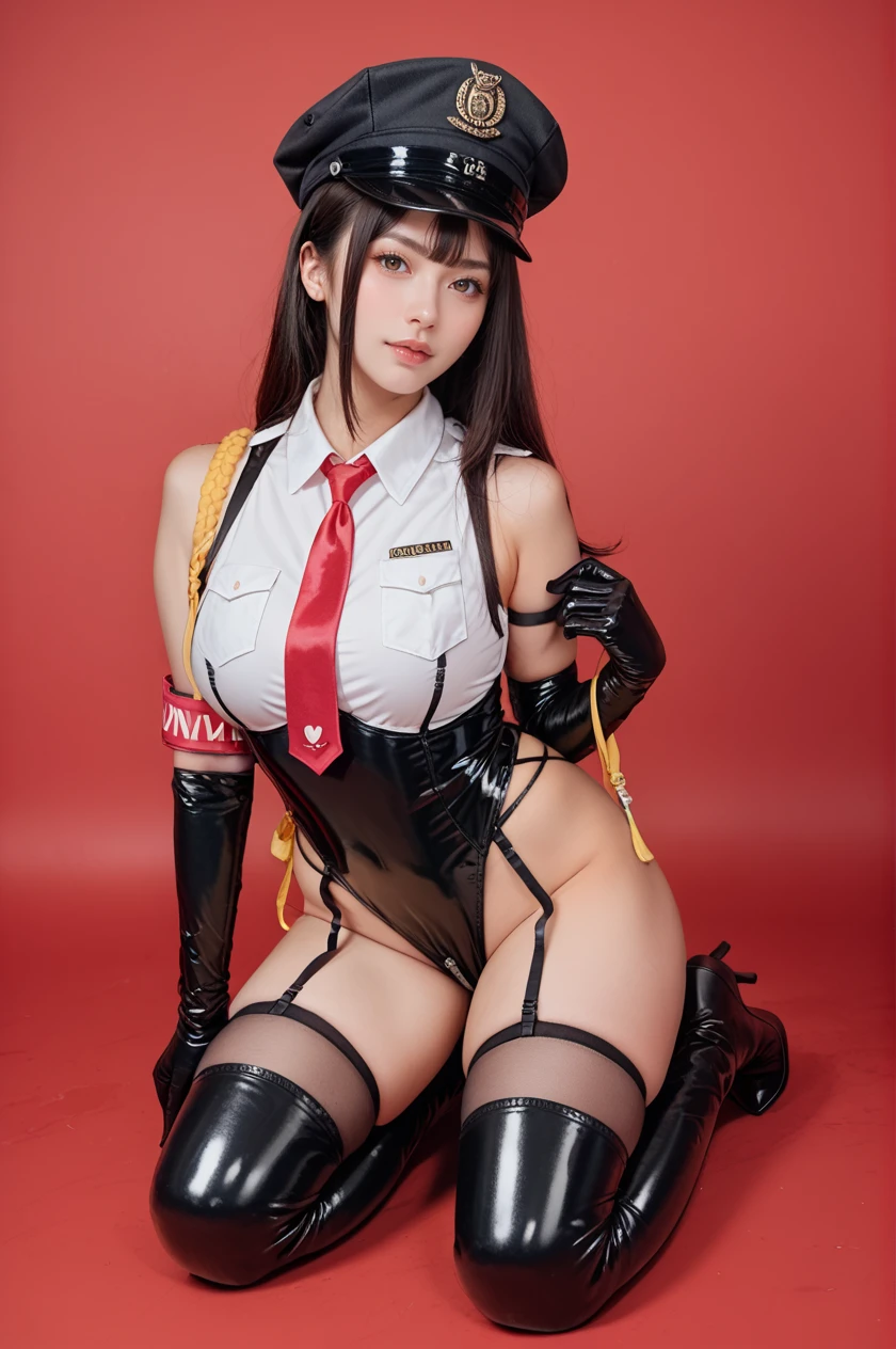 elbow gloves,armband,collared shirt,leotard,necktie,peaked cap,garter straps,thigh boots