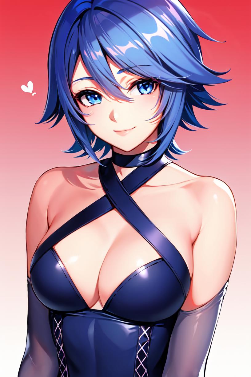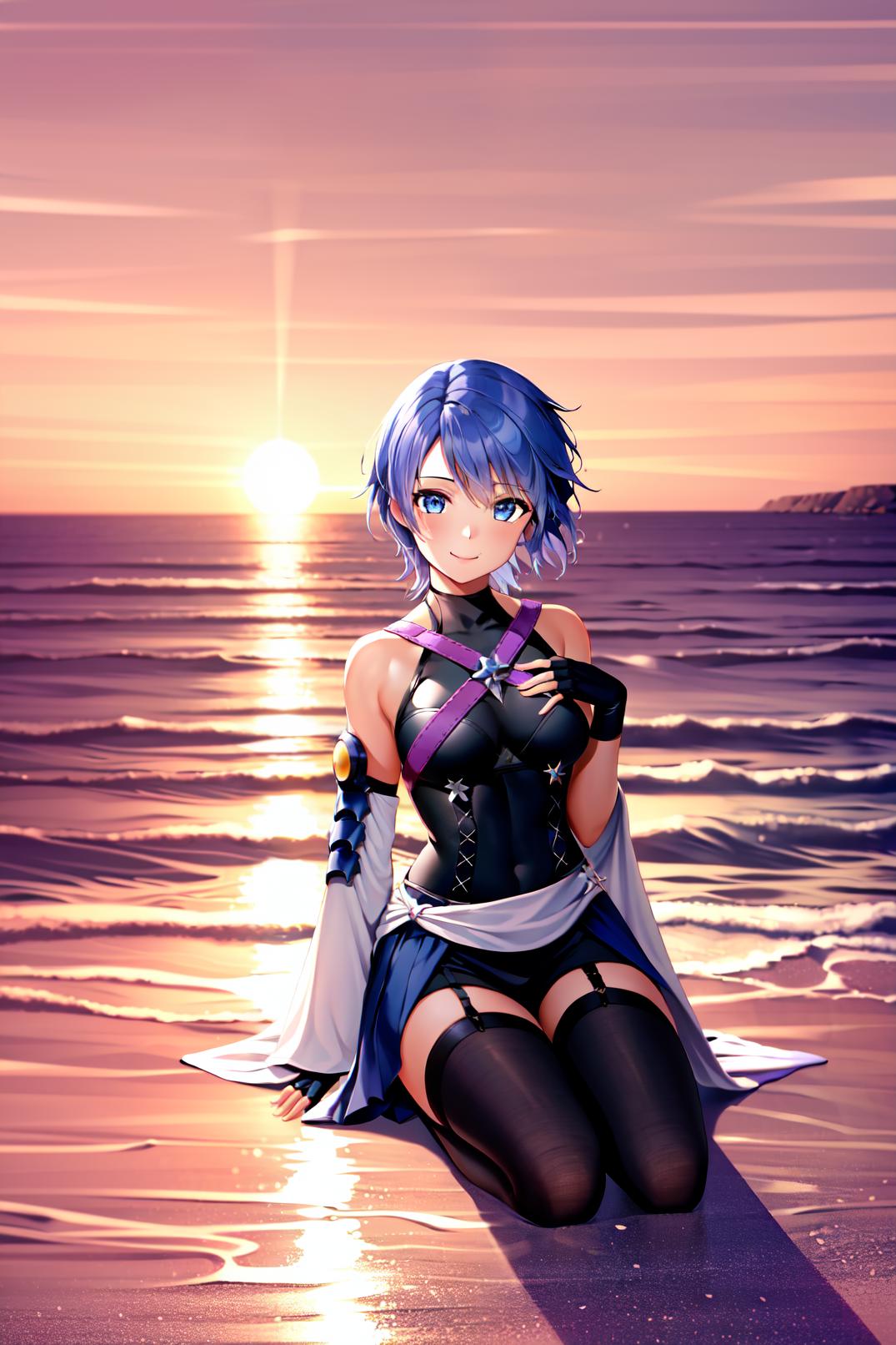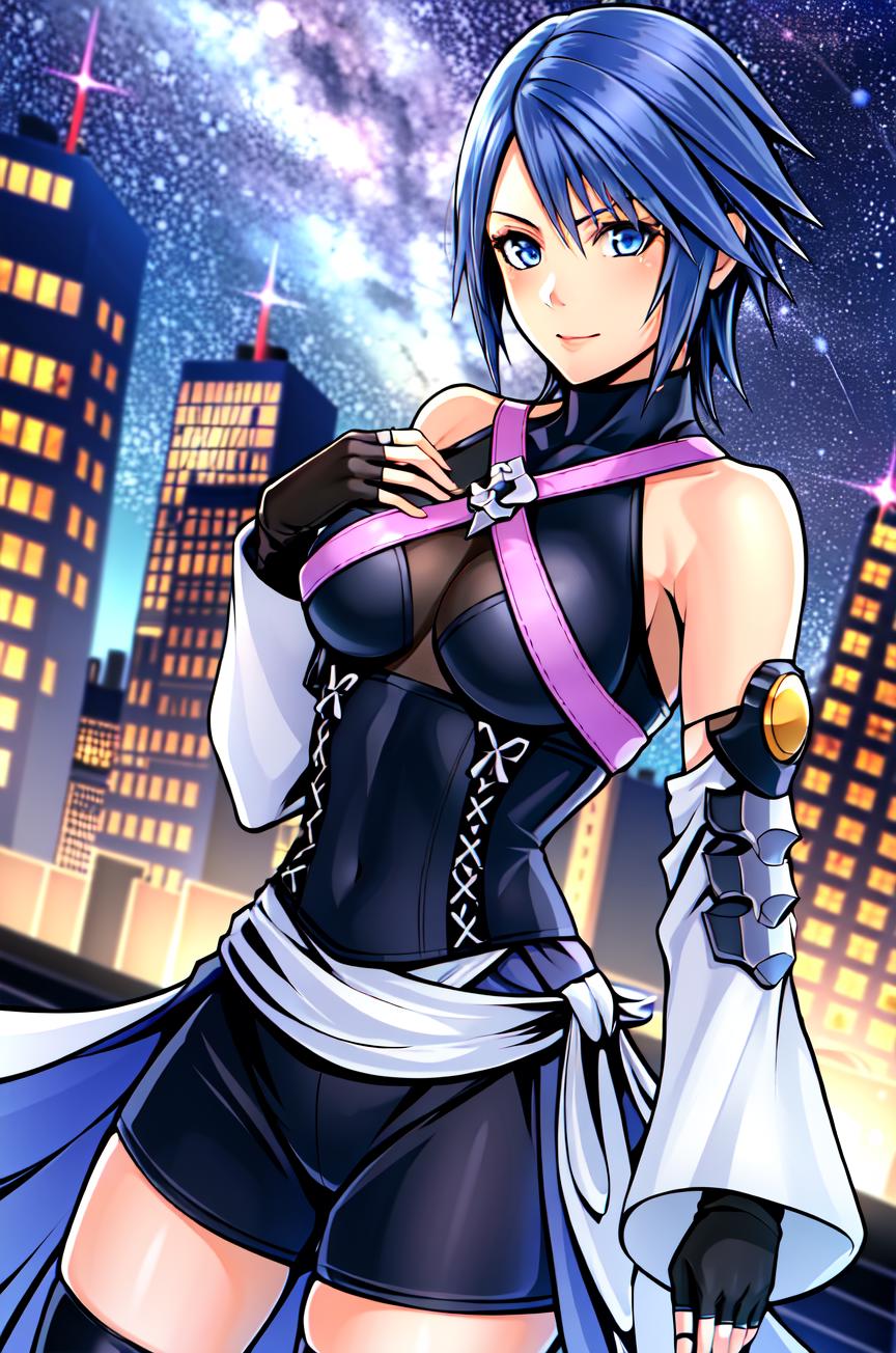 Triggers with aqua \(kingdom hearts\), but if you want her costume you also need to describe it, like in this example: blue hair, chest strap, elbow gloves, gloves, skirt, wide sleeves, medium breasts, detatched sleeves, black shorts, fingerless gloves, thighhighs. Weight should be around 0.5.