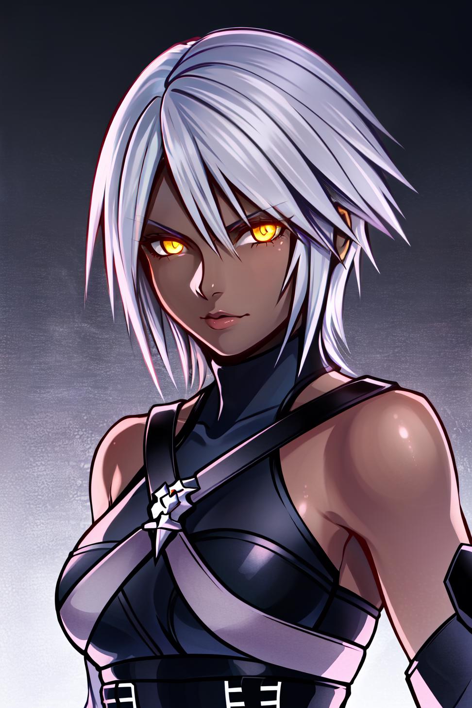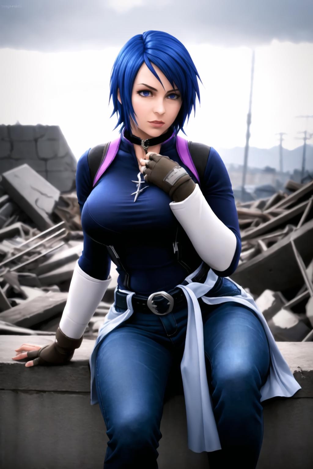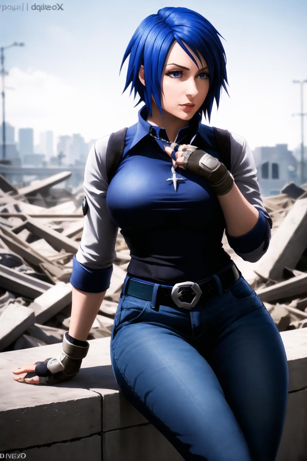 Triggers with aqua \(kingdom hearts\), but if you want her costume you also need to describe it, like in this example: blue hair, chest strap, elbow gloves, gloves, skirt, wide sleeves, medium breasts, detatched sleeves, black shorts, fingerless gloves, thighhighs. Weight should be around 0.5.