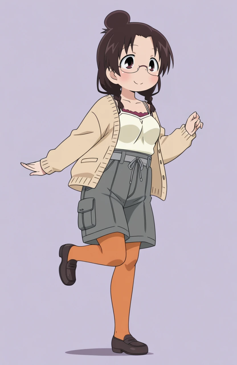 kuriyama aiko, semi-rimless eyewear, brown hair, low twin braids, topknot, medium breasts