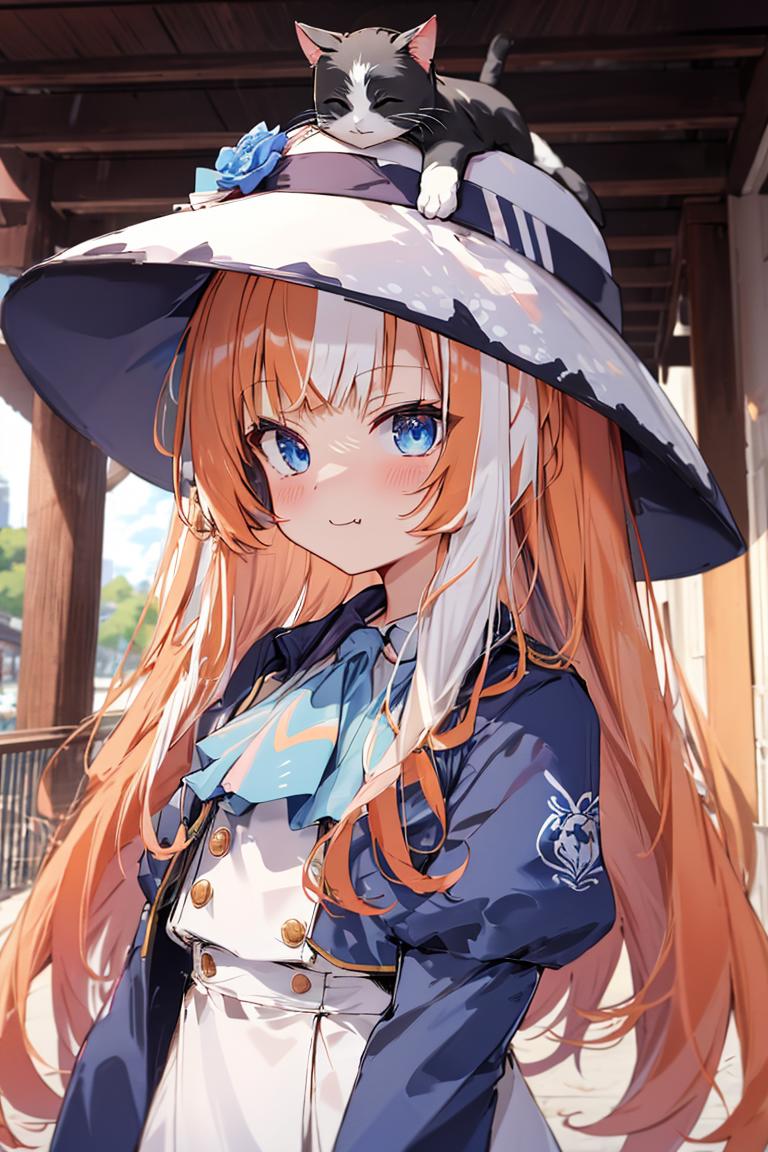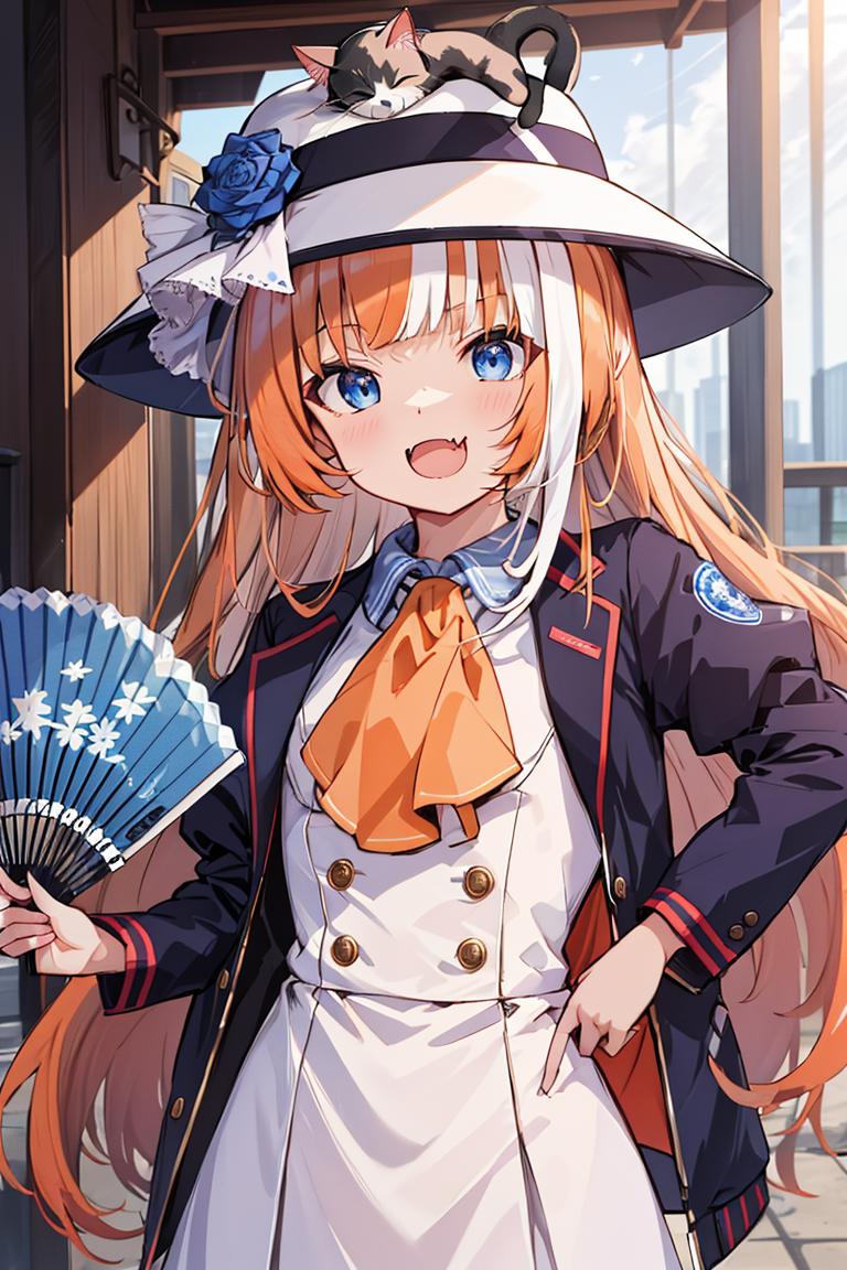 hat,hat flower,blue flower,blue rose,white headwear,animal on head,cat on head,dress,white dress,white skirt,long sleeves,puffy sleeves,jacket,blue jacket,cropped jacket,open jacket,open clothes,ascot,folding fan,socks,blue footwear,buttons,