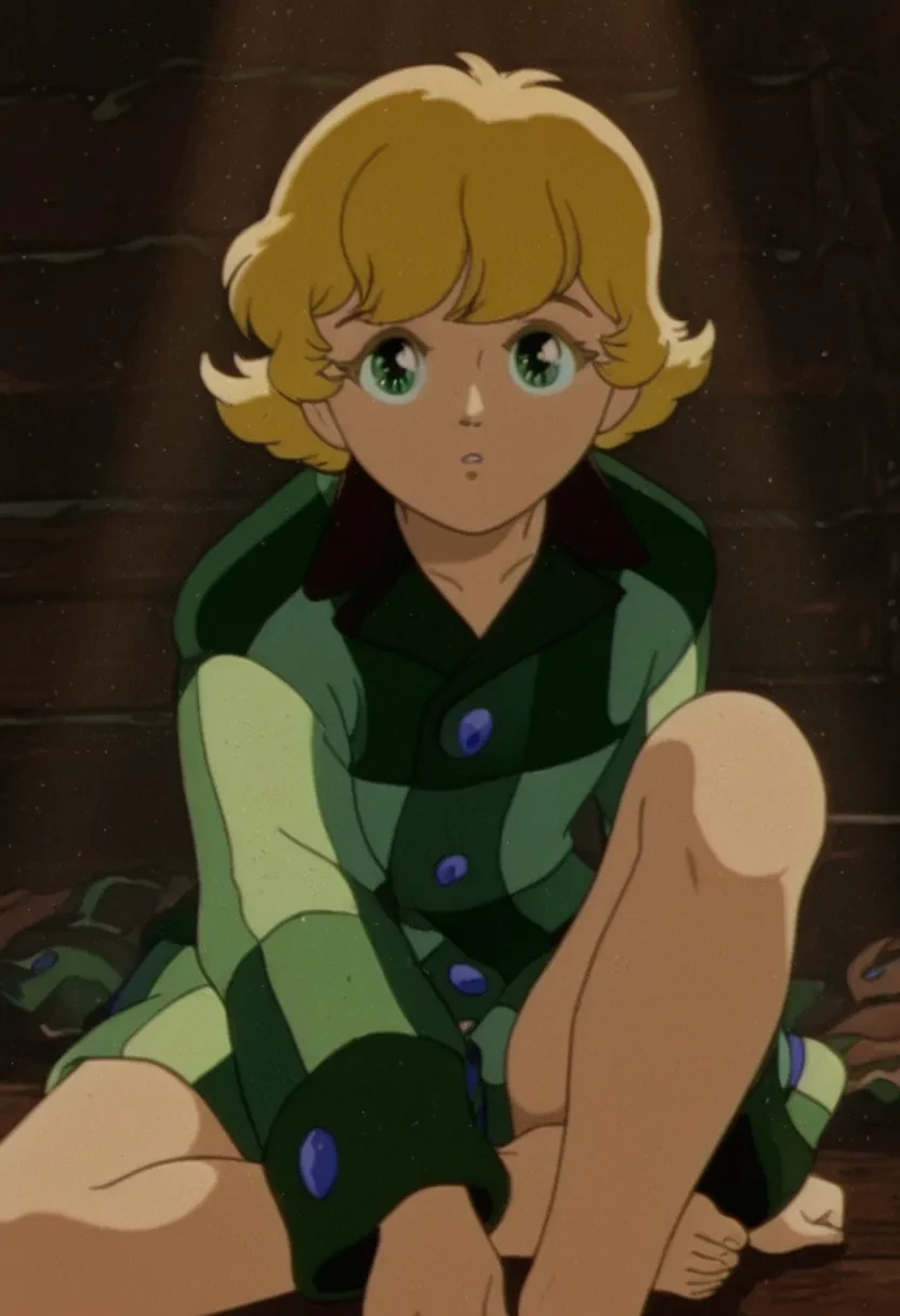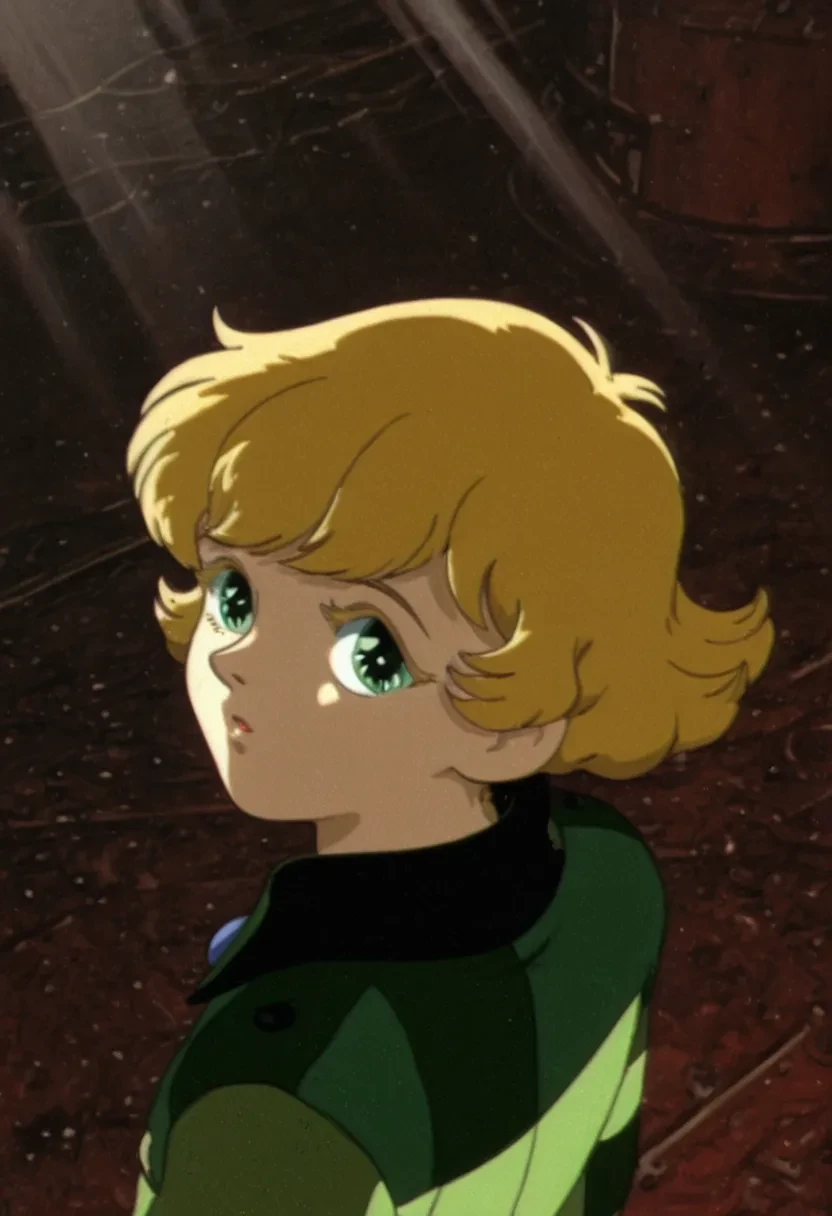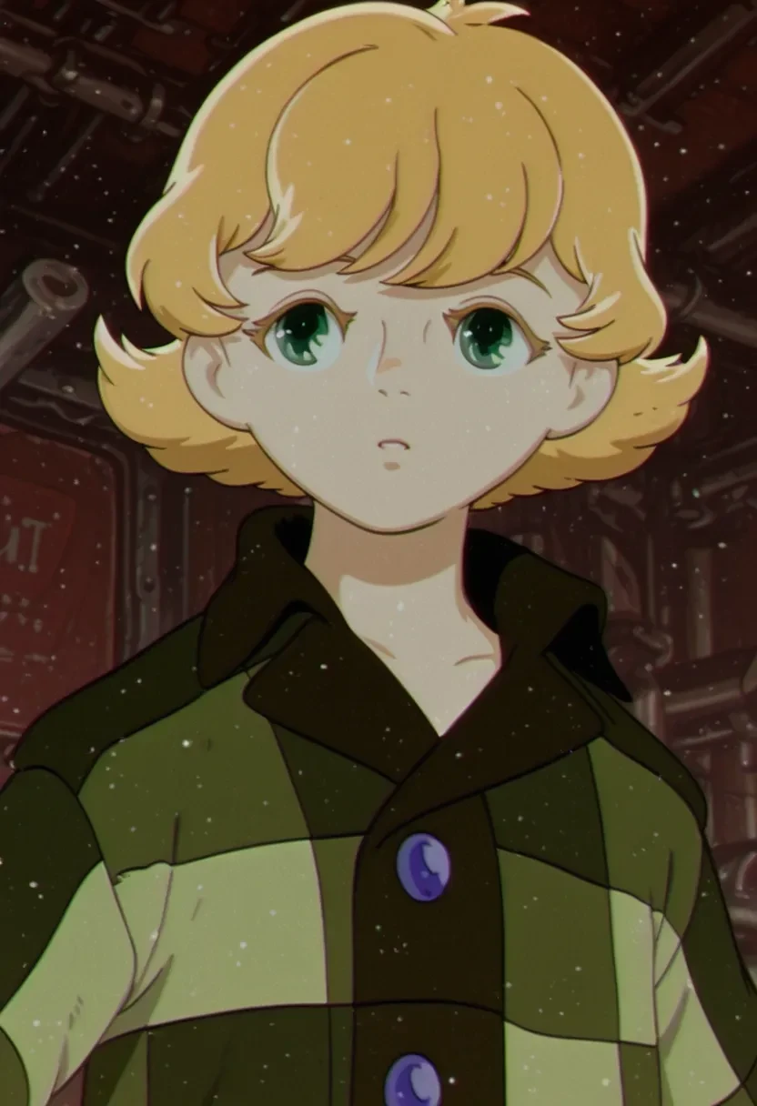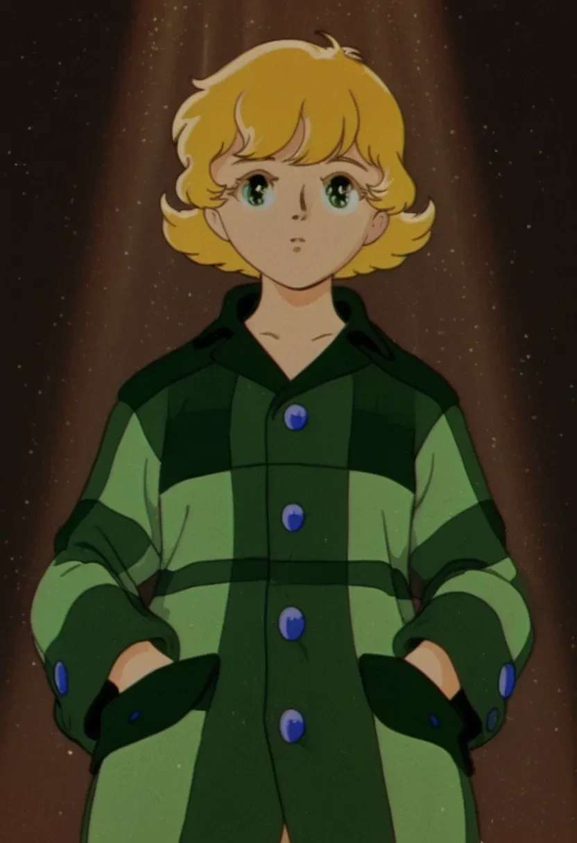 T1m4Mt2, short hair, blonde hair, bangs, green eyes, green clothes,blue buttons,retro artstyle