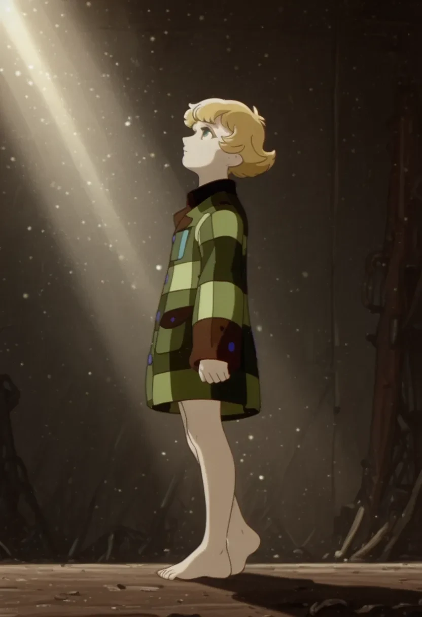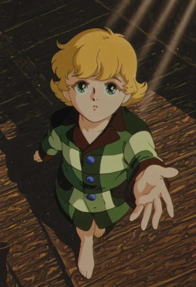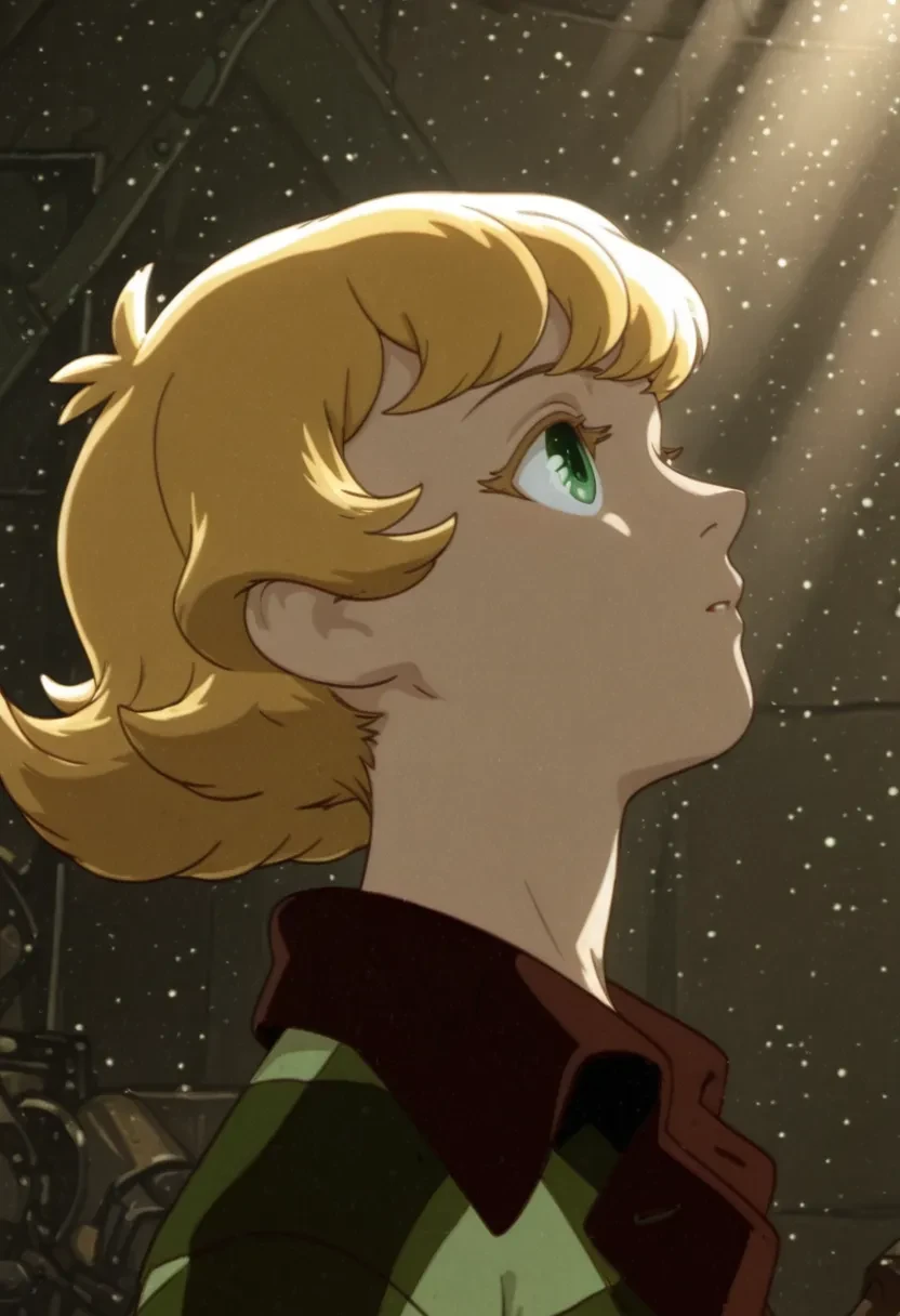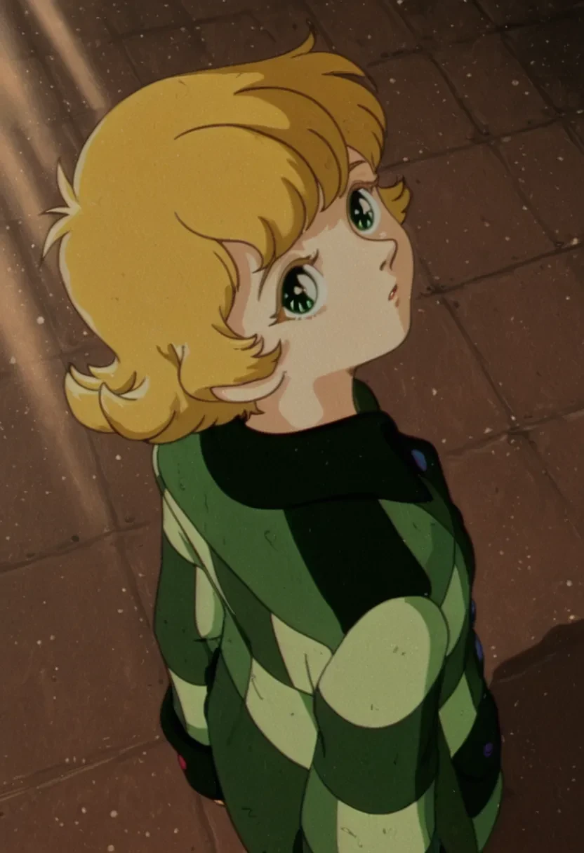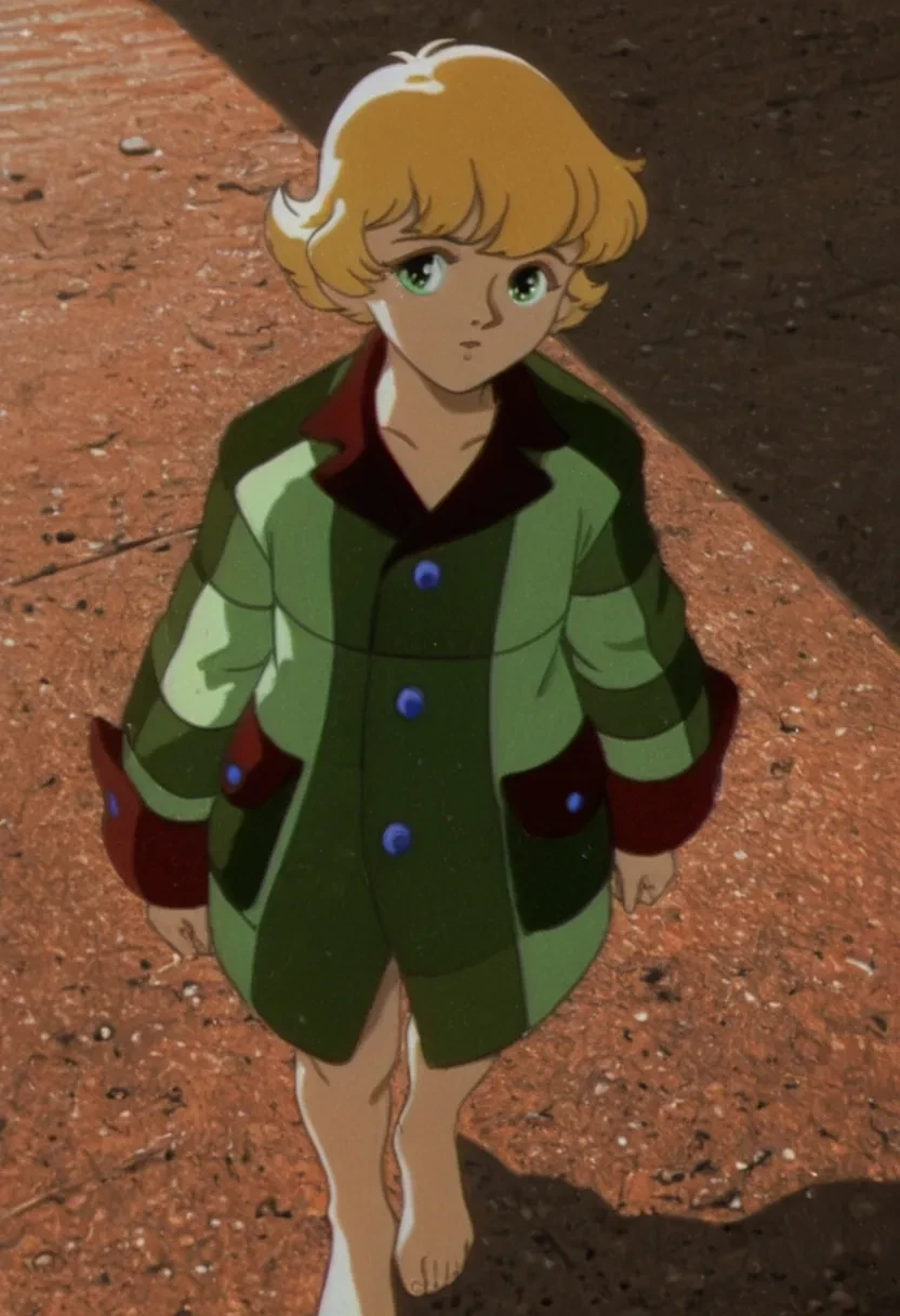 T1m4Mt2, short hair, blonde hair, bangs, green eyes, green clothes,blue buttons,retro artstyle