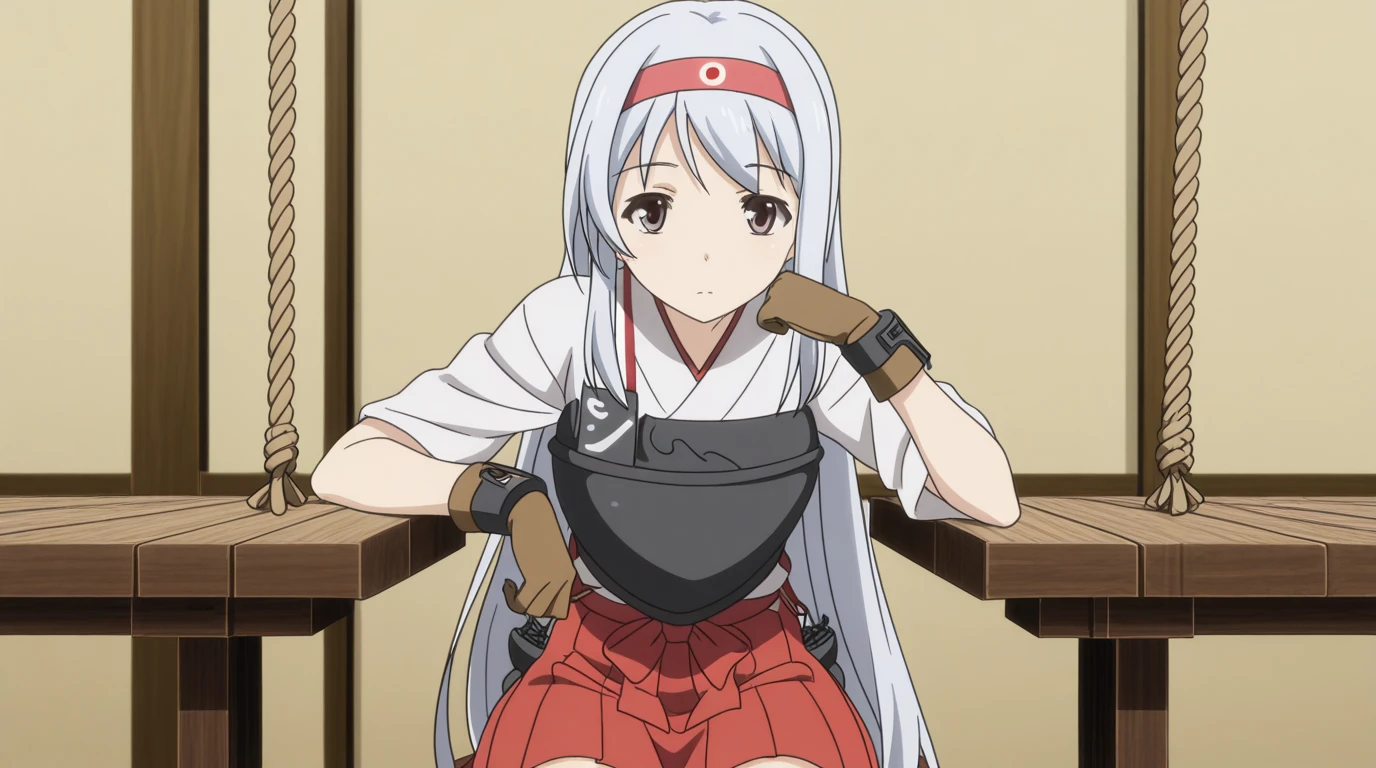 shoukaku, shoukaku (kancolle), long hair, brown eyes, white hair, grey hair, hairband, headband, mature female, small breast, anime screencap