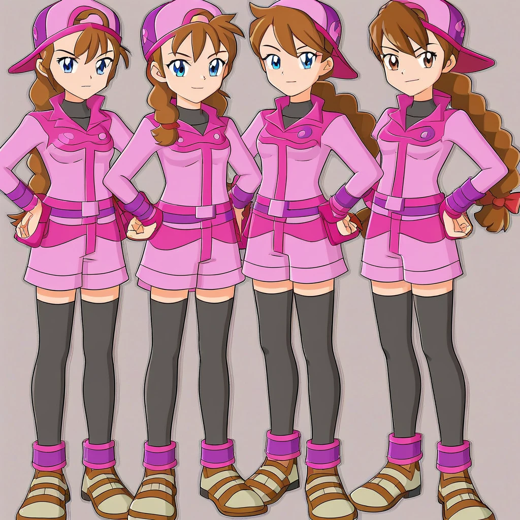 black turtleneck, pink collar jacket, purple cuffs, pink mid rise denim shorts, red pouch, black thigh highs, brown strap shoes with sand ankle cuffs and black soles, pink and black belt, gold triangle belt buckle