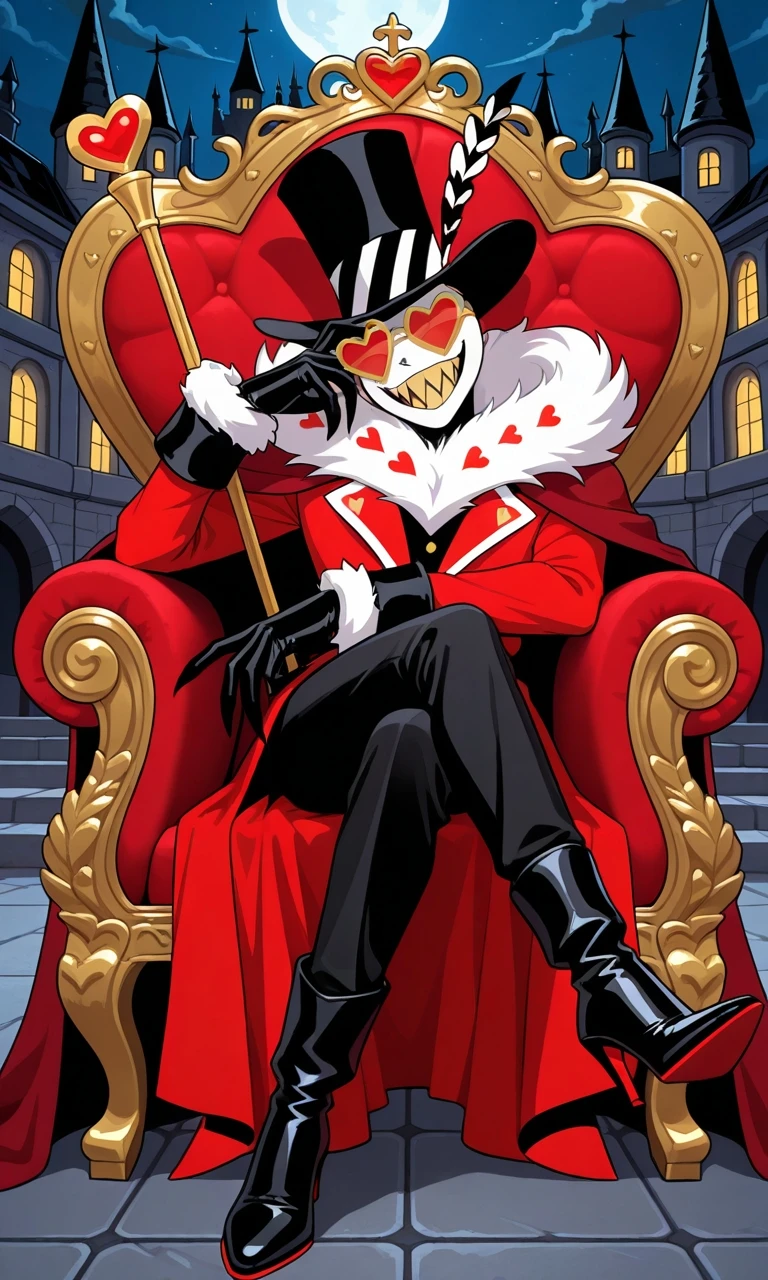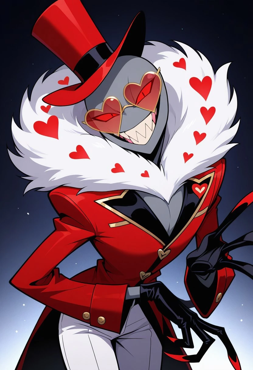 long red coat, fluffy white trim, fur collar with heart accents, white pants, red top hat, heart-shaped glasses, gold glasses, black gloves, black boots