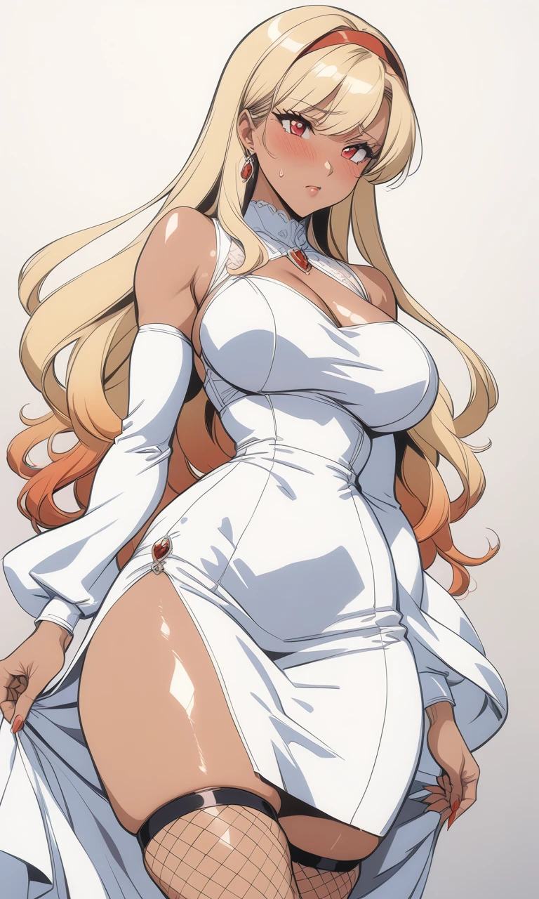 1girl, solo_focus, blonde hair, red eyes, hair band, gradient hair, tanned skin, large breasts, mature female