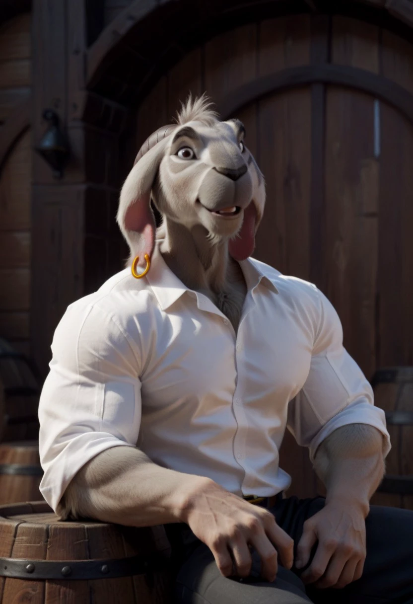 Djali, Goat, Disney, light-grey fur, grey markings, earing, animal ears, goat ears, goat horns, grey snout, black nose, black eyes