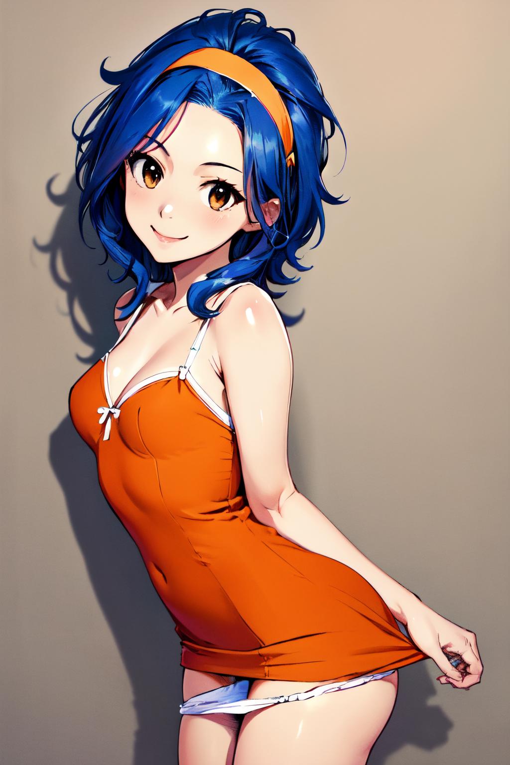 levy,1girl,solo ,breasts,blue hair,hairband, brown eyes,orange dress,short dress, hair flower,
