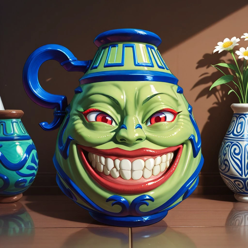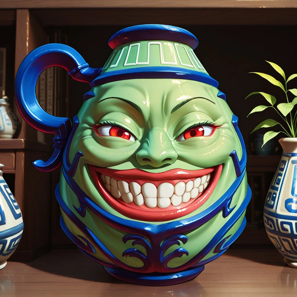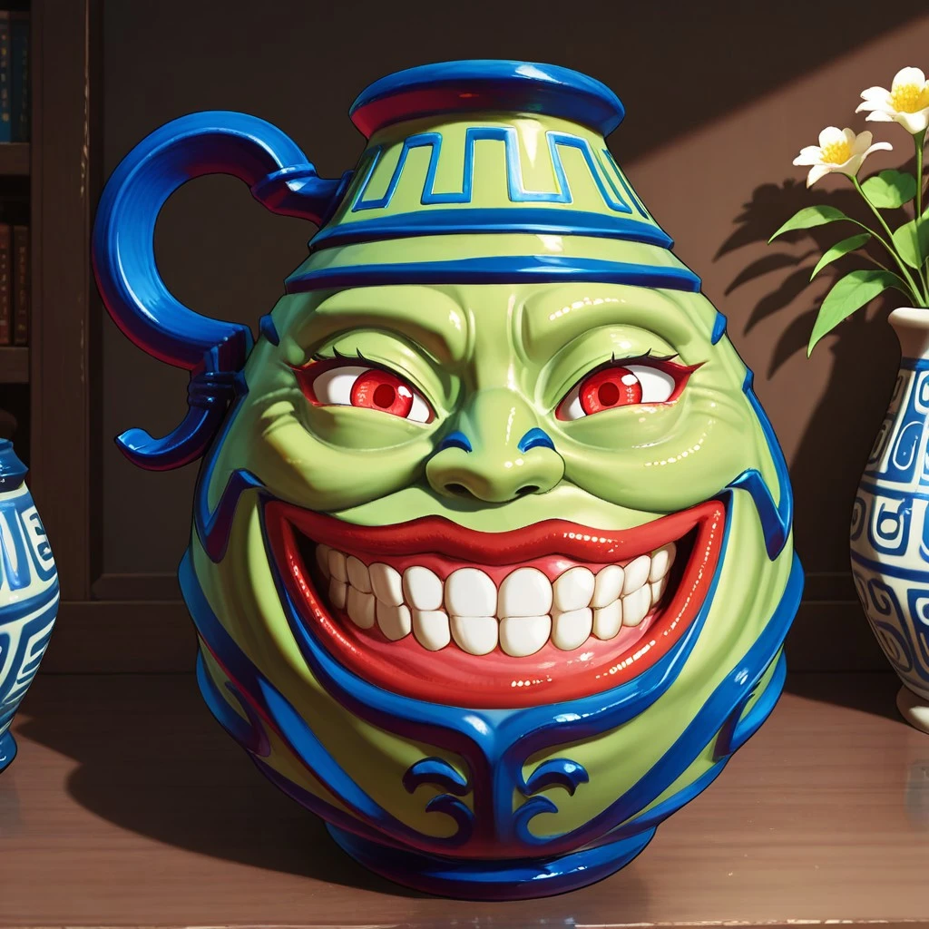 pot of greed, pot, blue handle, red eyes, red sclera, red lips, solid eyes, yellow teeth, squinting, green skinVersion: Other Pots + Custom: