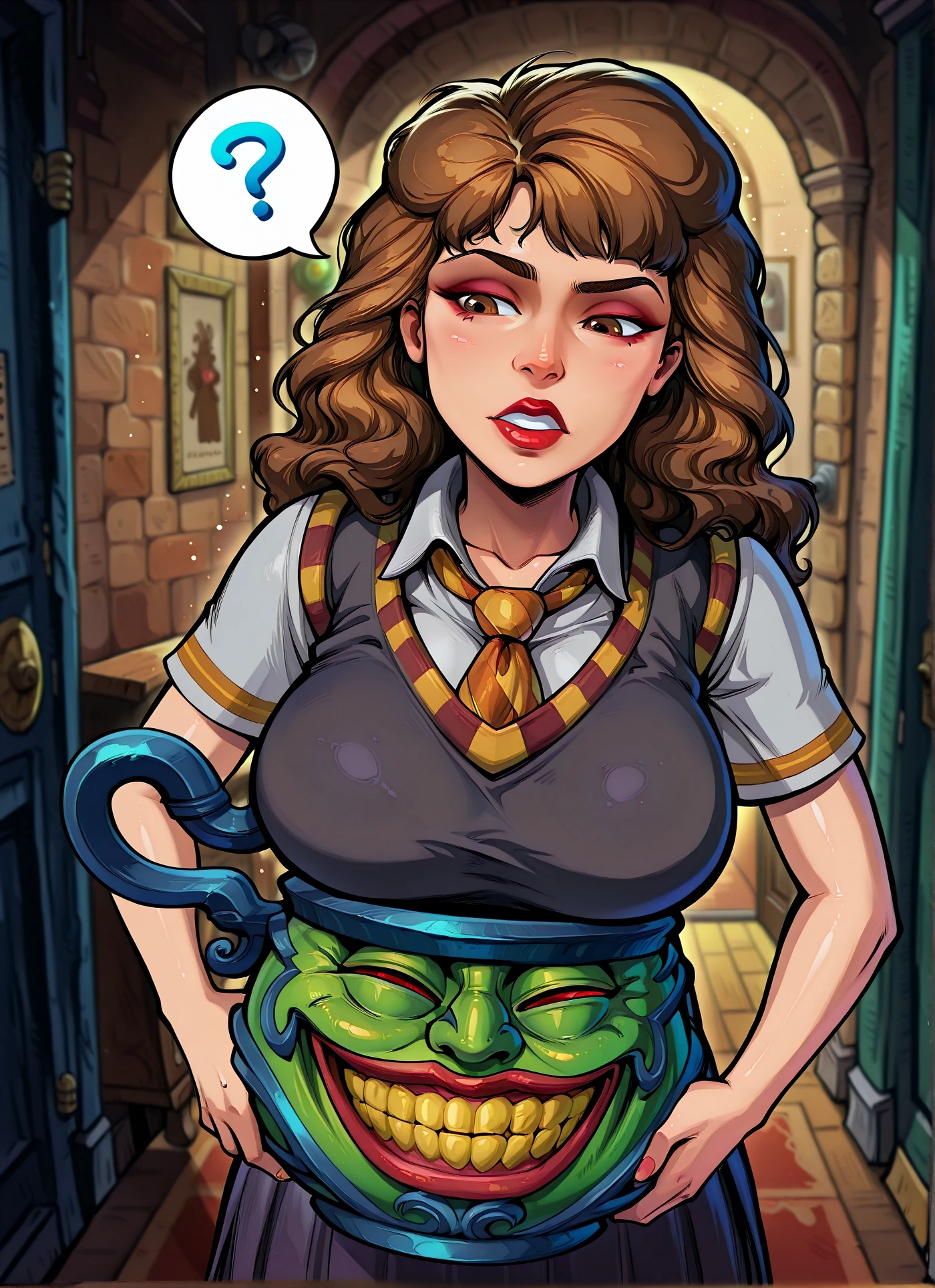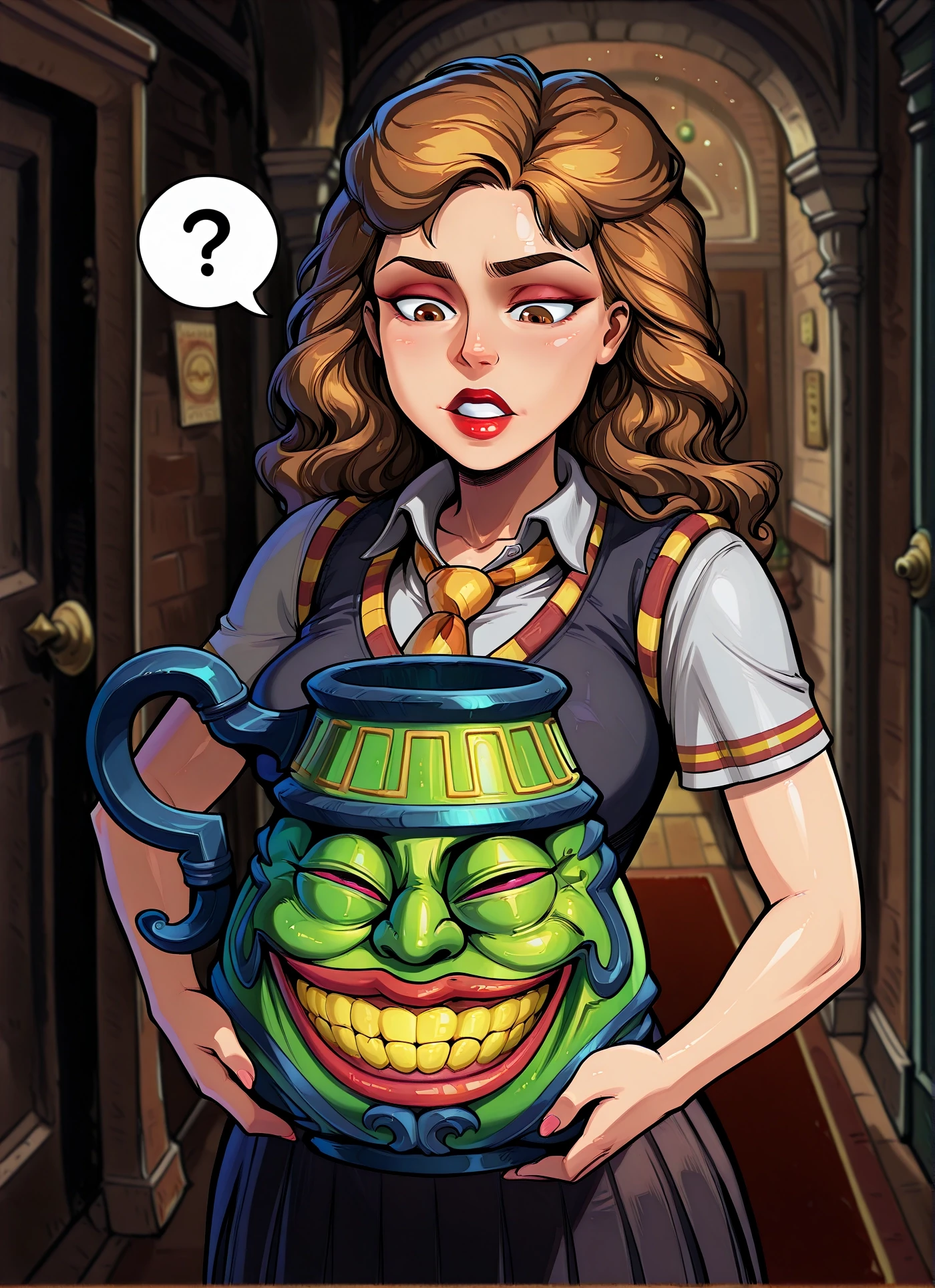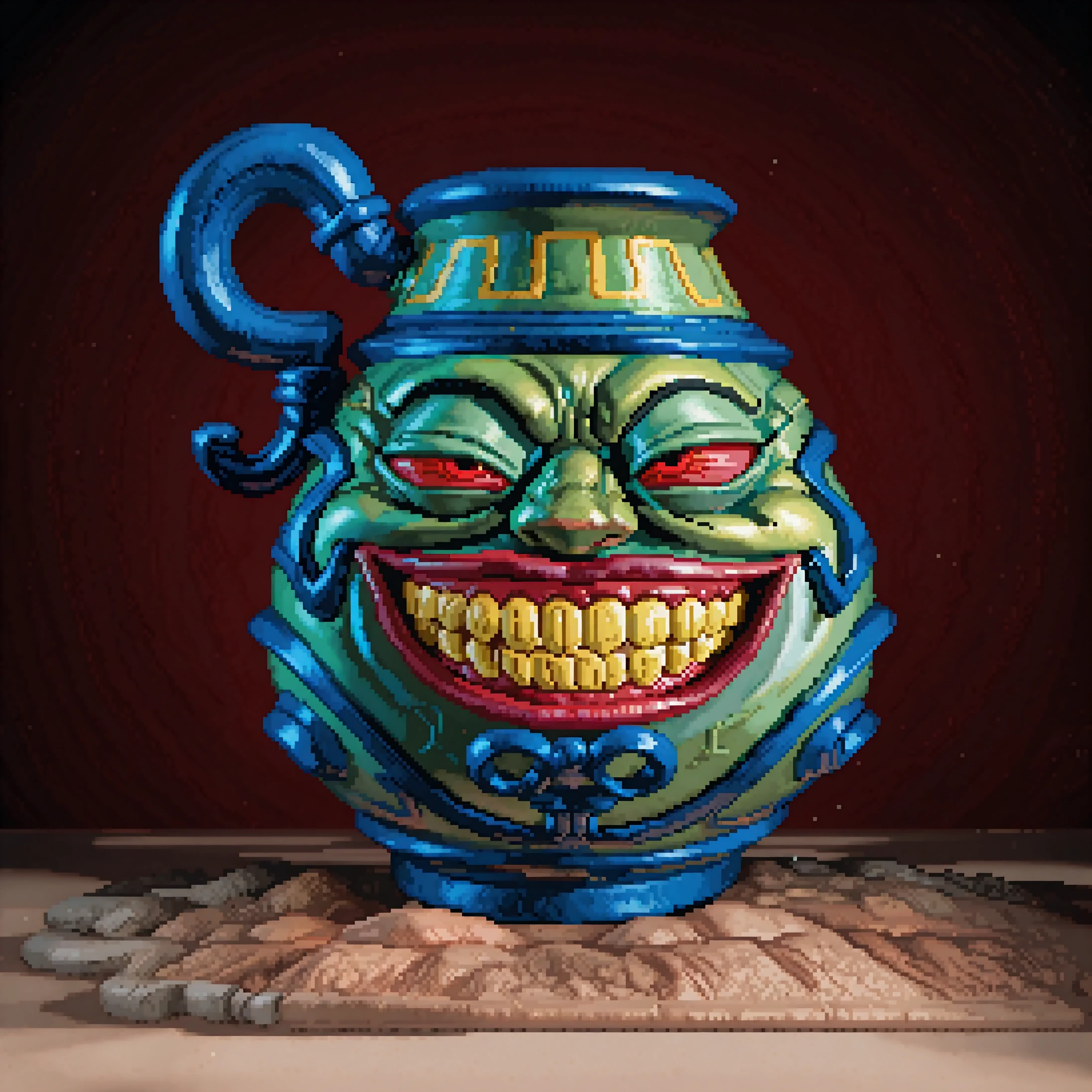 pot of greed, pot, blue handle, red eyes, red sclera, red lips, solid eyes, yellow teeth, squinting, green skinVersion: Other Pots + Custom: