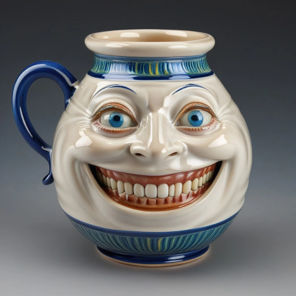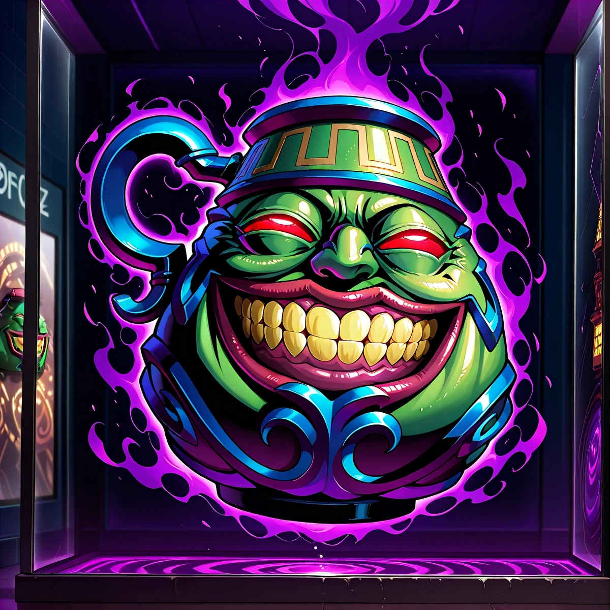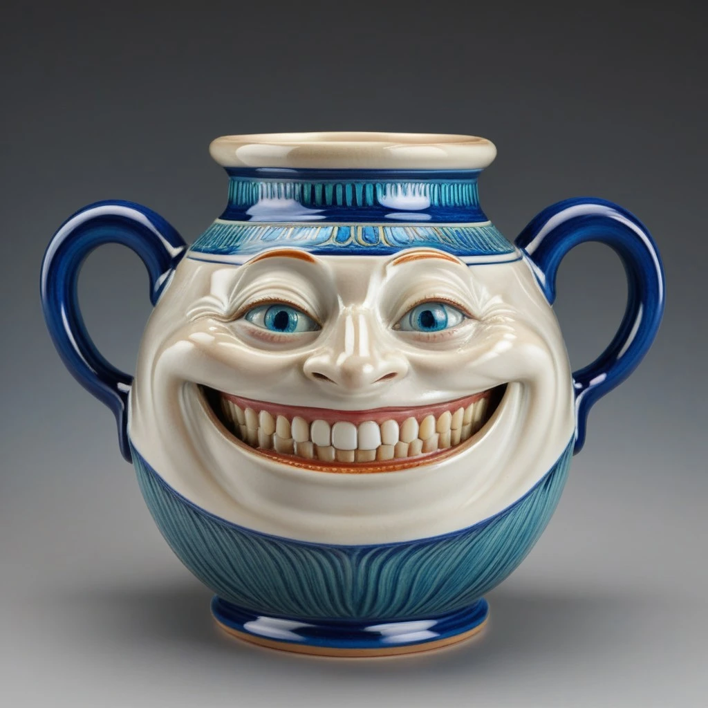 pot of greed, pot of avarice, pot of acquisitiveness, pot of generosity, pot of benevolence, jar of greed, jar of generosity, jar of avarice, jar, vase, pot, pottery, handle, handles, (Color) eyes, (Color) sclera, (Color) lips, solid eyes, (Color) teeth, squinting, (Color) skin, Description