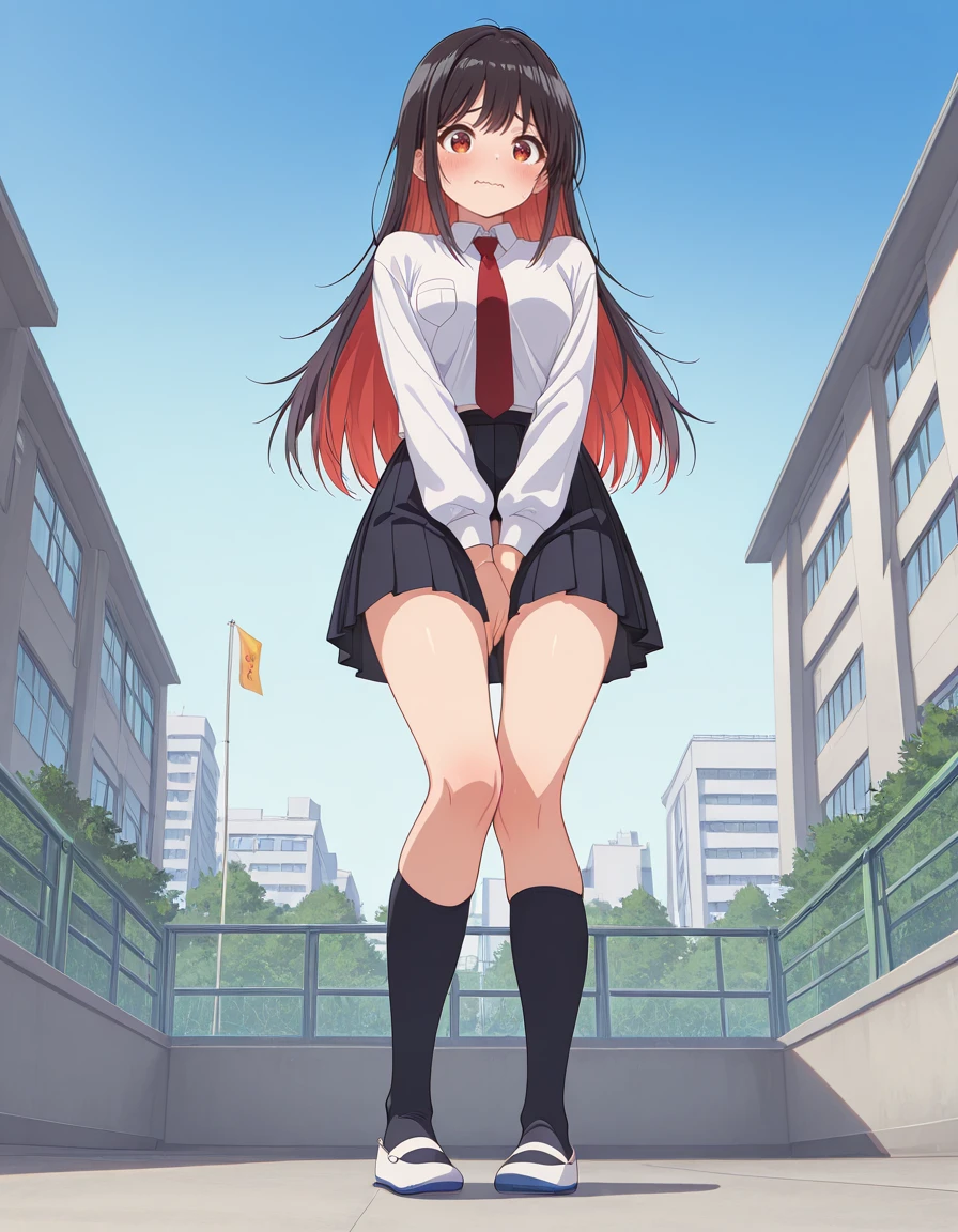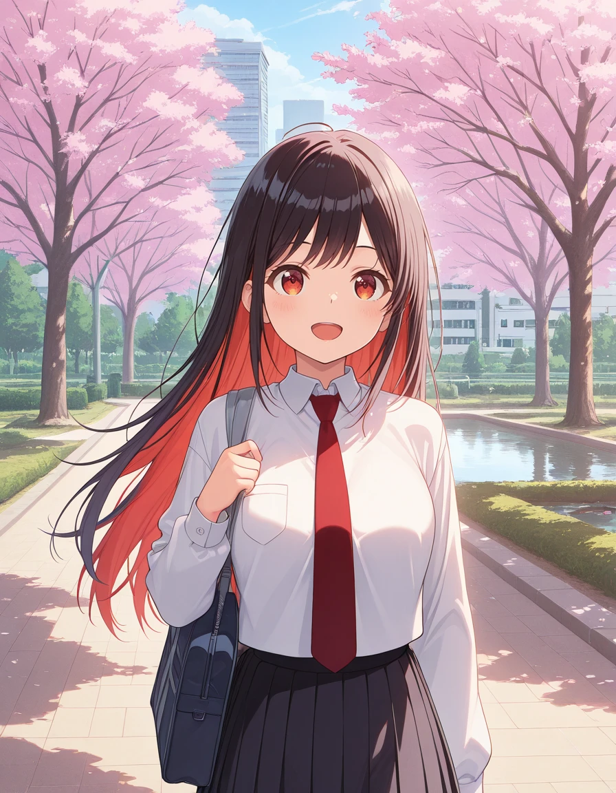 <lora:shinobu_uzuki-mayonaka_heart_tune-s1-v3-ixl-anime-soralz:1>, shinobu uzuki (mayonaka heart tune), long hair, black hair, multicolored hair, colored inner hair, red hair, red eyesOutfit - School Uniform