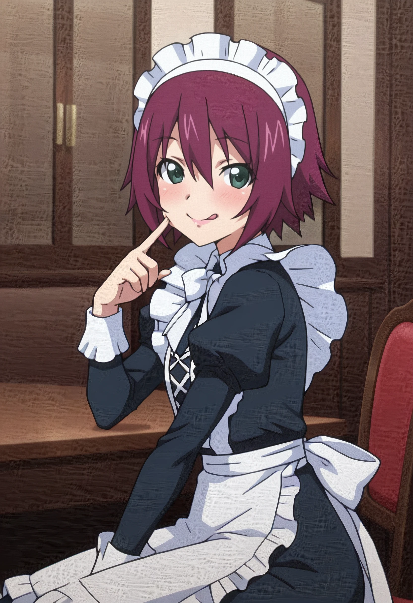 M4n4gerMaid, maid, maid headdress, apron, white apron, maid apron, puffy sleeves, juliet sleeves, long sleeves, dress, frills, black dress, enmaided, white bow, bow, white bowtie, bowtie, frilled apron, cross-laced clothes, collared dress,