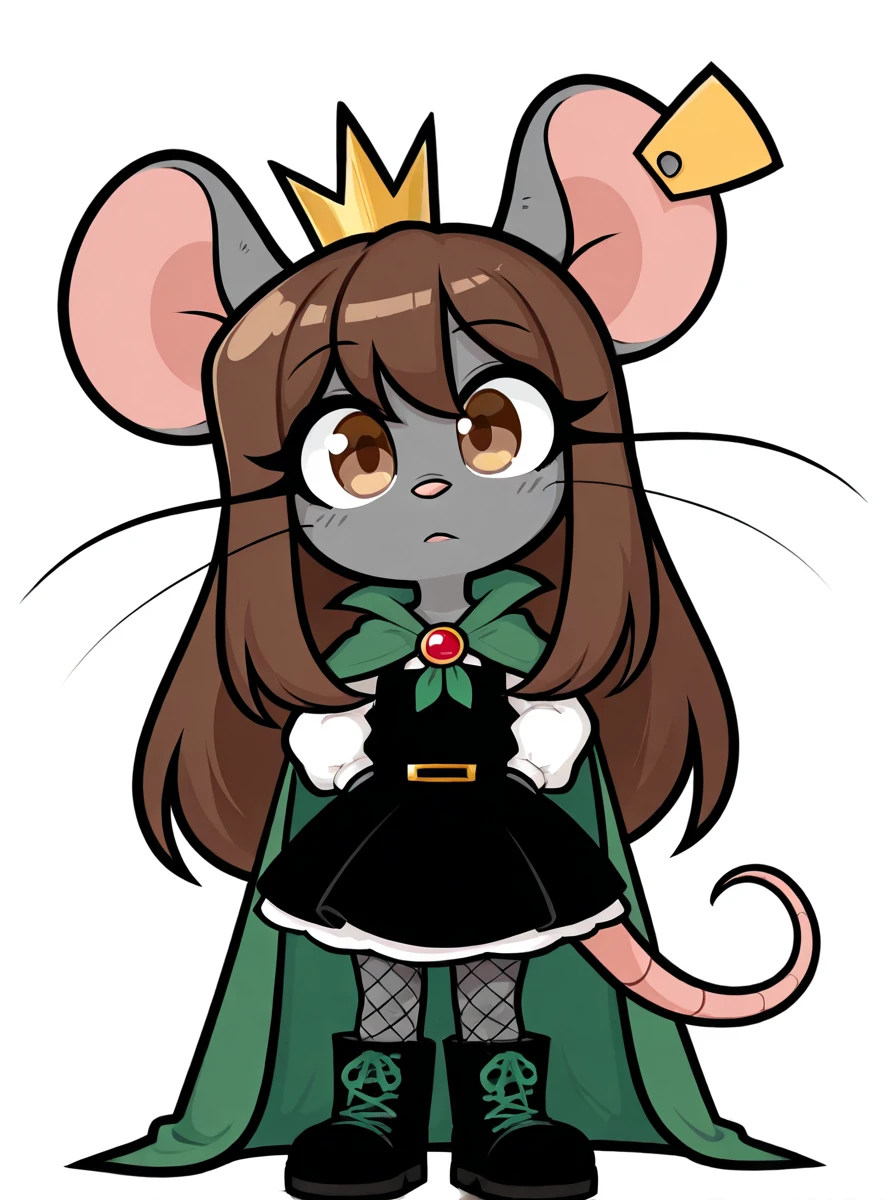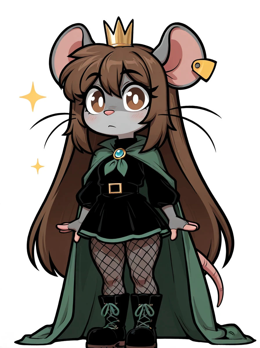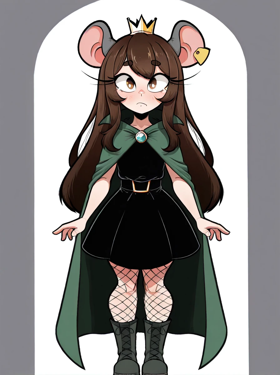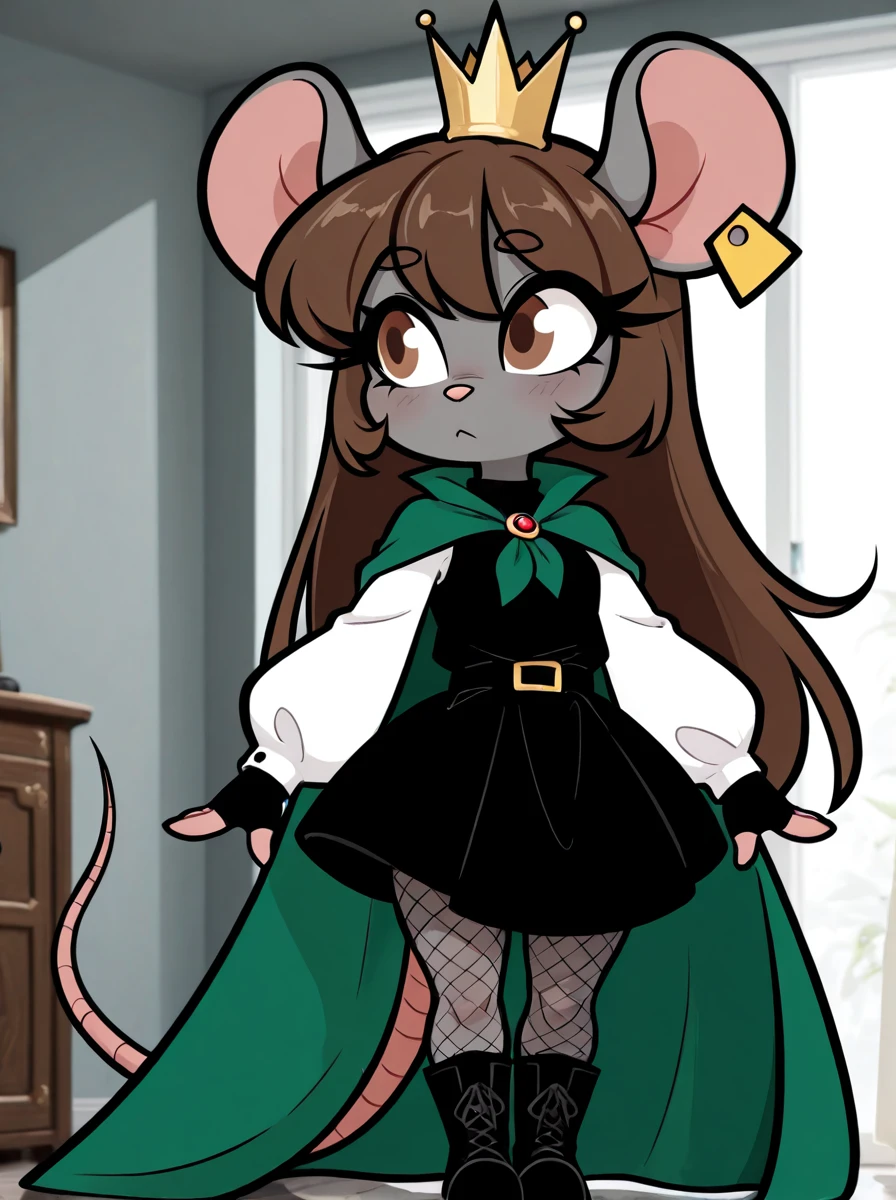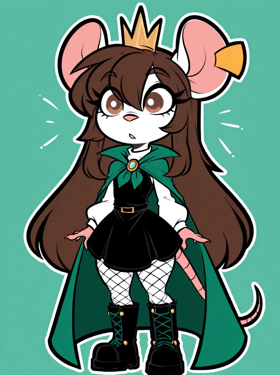 Triggers: anthro, female, rodent, light grey body, mini crown, brown hair, long hair, light brown eyes, rat ears, ear tag, rat girl, long eyelashes, petite, black dress, green cape, fishnet pantyhose, boots, white sleeves