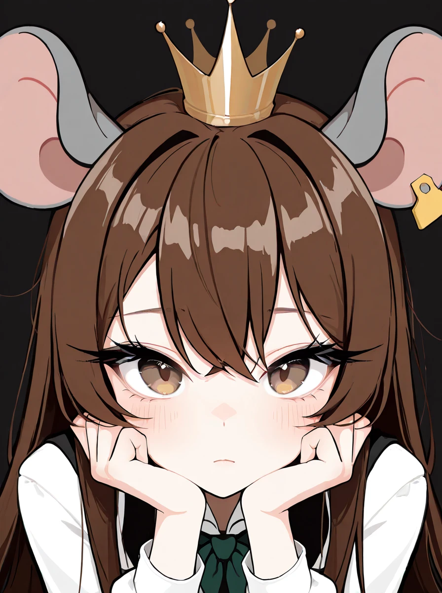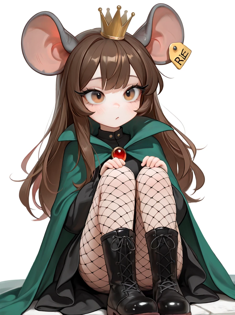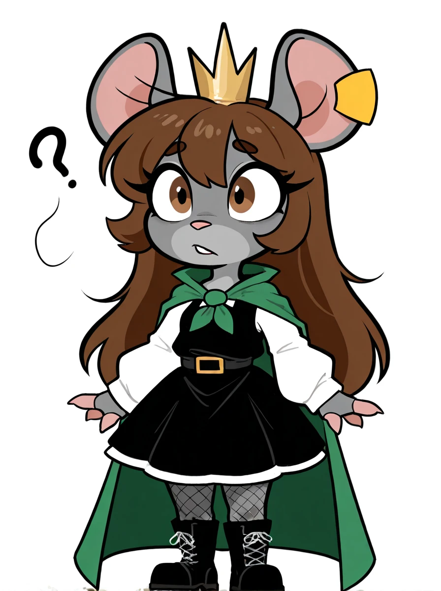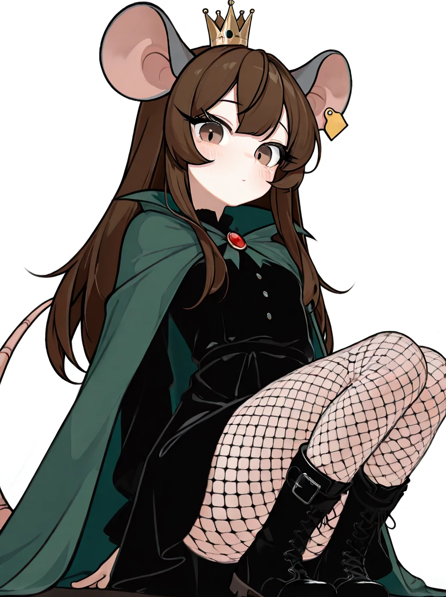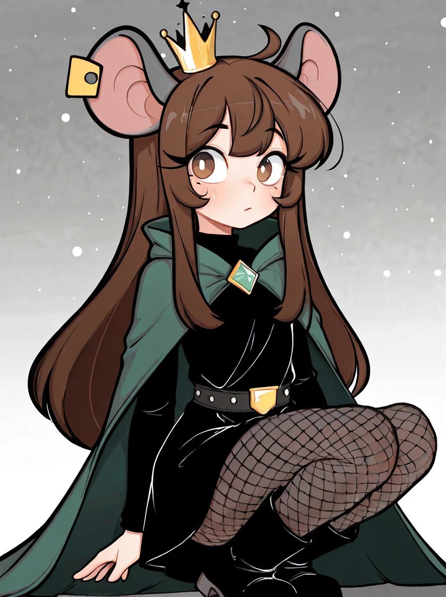 Triggers: anthro, female, rodent, light grey body, mini crown, brown hair, long hair, light brown eyes, rat ears, ear tag, rat girl, long eyelashes, petite, black dress, green cape, fishnet pantyhose, boots, white sleeves