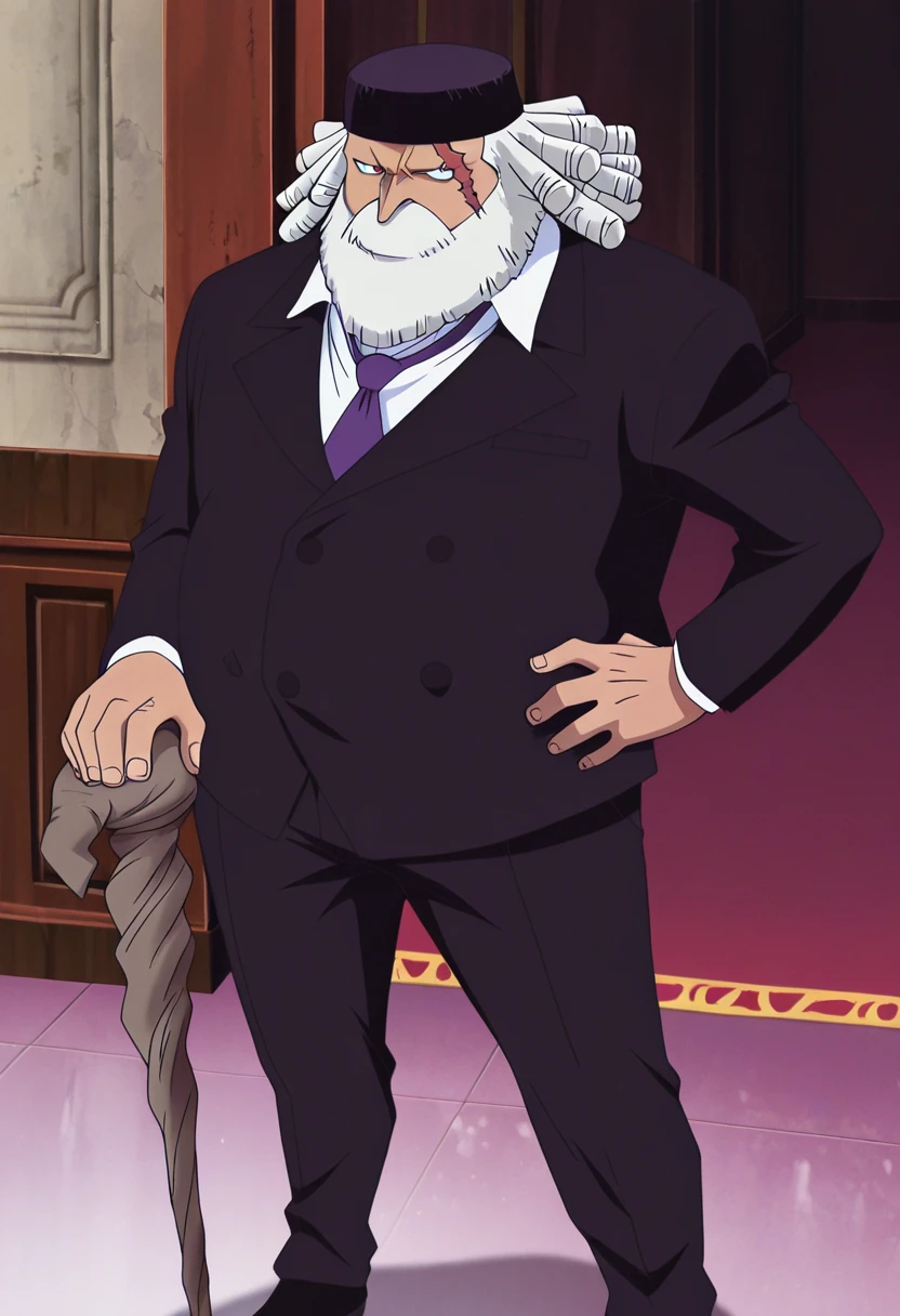 A character LoRa for Jaygarcia Saturn from One Piece. He is one of the Five Elders of World Govt. appearing first in Episode 151 "The 100,000,000 Man! The World's Highest Authority and the Pirate Blackbeard" of the anime. Trained with images from different artists and a few screencaps from different story arcs (the Five Elders only appear in a few episodes previous to Episode 1000 showing them at their residence in Mary Joa). Unfortunately his body type did not really bake in since there weren't that many good full body images and some artist renditions did not show him correctly. You can try adding "h*mp" (which illustrious should not know, but it does something) and "plump" to the prompt (replace * with "u", praise the profanity filter :P). This was a request by @yoden22.