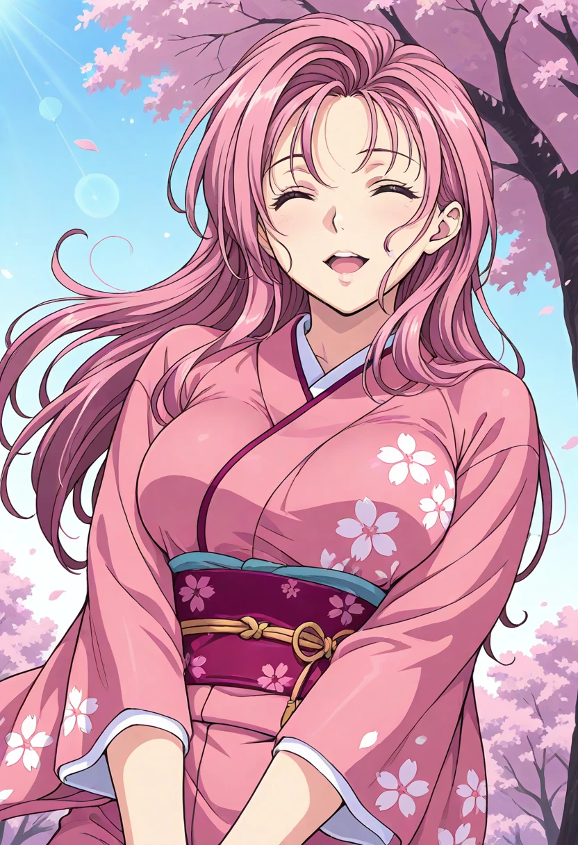 pink hair, long hair, large breasts, purple eyes, blue eyes