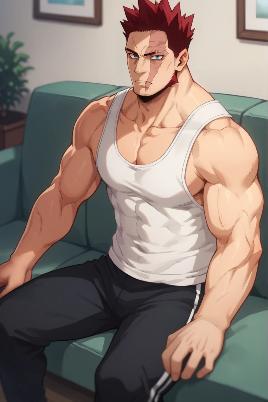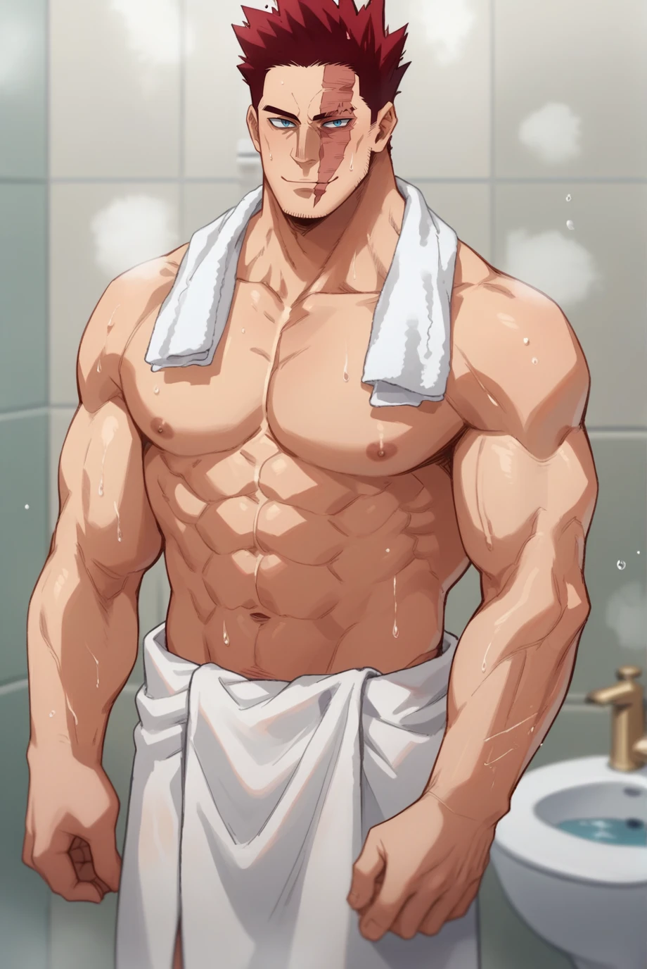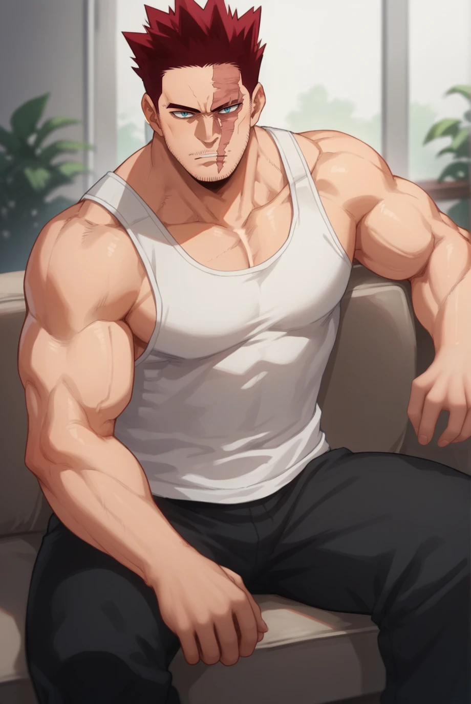 <lora:EndeavorXL-v1-07:0.7>, ChopioEndeavor, red hair, short hair, spiked hair, blue eyes, looking at viewer, muscular male, mature male, scar on face,